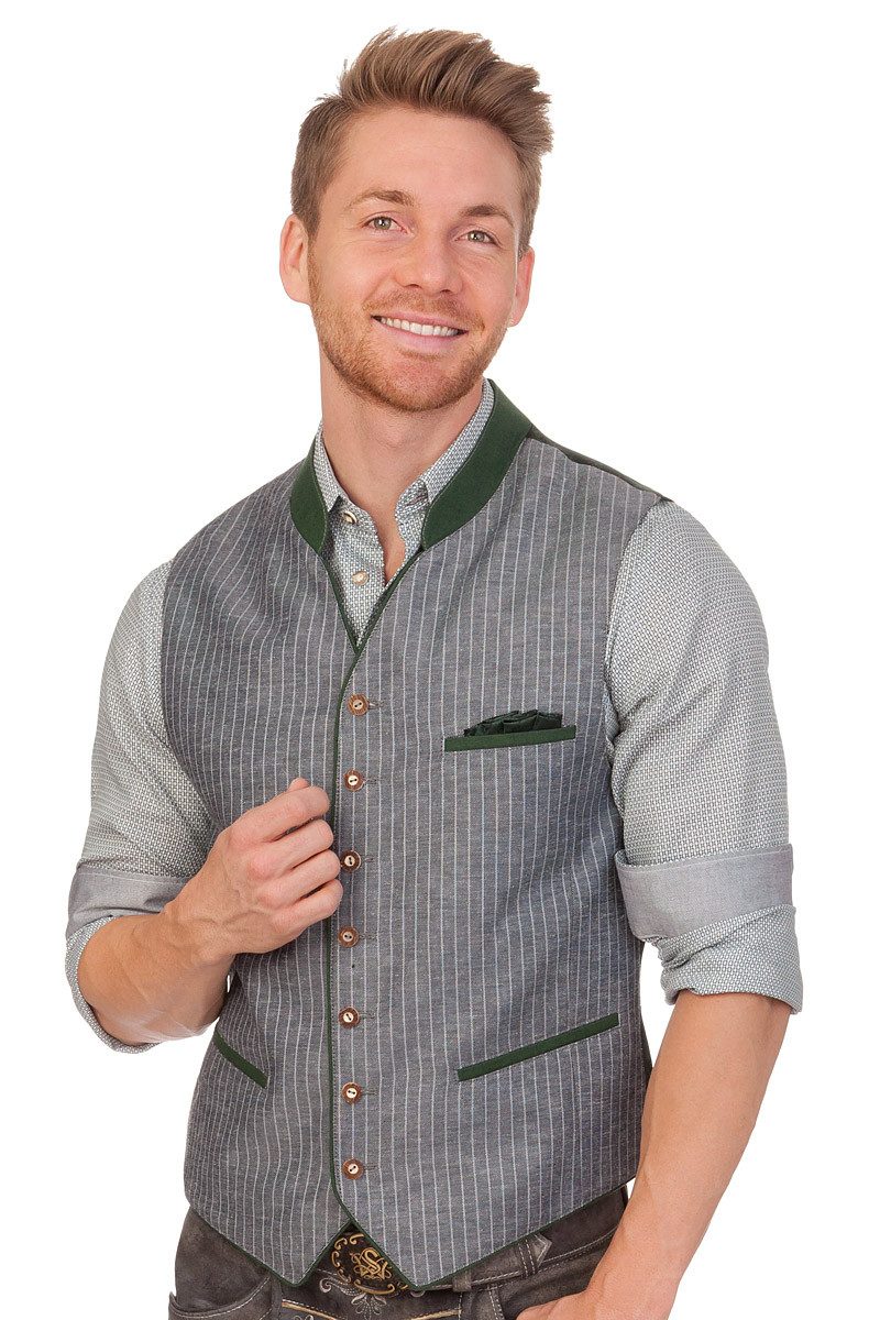 Die fesche Trachtenweste Wangen für Herren mit Leinen-Anteil ist ein trendy Wiesn-Klassiker aus dem Hause 1890 Country by Murk und super passend zu Trachtenjeans und Lederhose. Das feine, diagonale Webmuster im Melange-Look in Kombination mit den eingewebten Nadelstreifen harmoniert super mit dem robusten Kontraststoff in Grün, aus dem der schöne Stehkragen und die breiten Paspeln der Brusttasche links sowie der Seitentaschen gefertigt sind. Auch die schmalen Paspeln der Knopf-, der Knopflochleiste und des Saums vorn sind mit diesem Kontraststoff veredelt. Urige Knöpfe in Hirschhorn-Optik zieren die Knopfleiste. Der glanzvolle, grün-schwarze Satinrücken mit stylischen Hirsch-Motiven, einem kleinen V-Schlitz unten und dem typischen Riegel mit zwei kleinen, silberfarbenen Schnallen komplettiert die Kreation zusammen mit dem im Lieferumfang enthaltenen Einstecktuch aus Satin mit Hirsch-Muster. Das angenehme, schimmernde Innenfutter sorgt für einen guten Tragekomfort. Bitte beachten Sie die Übergrößenzuschläge ab Размер 56.