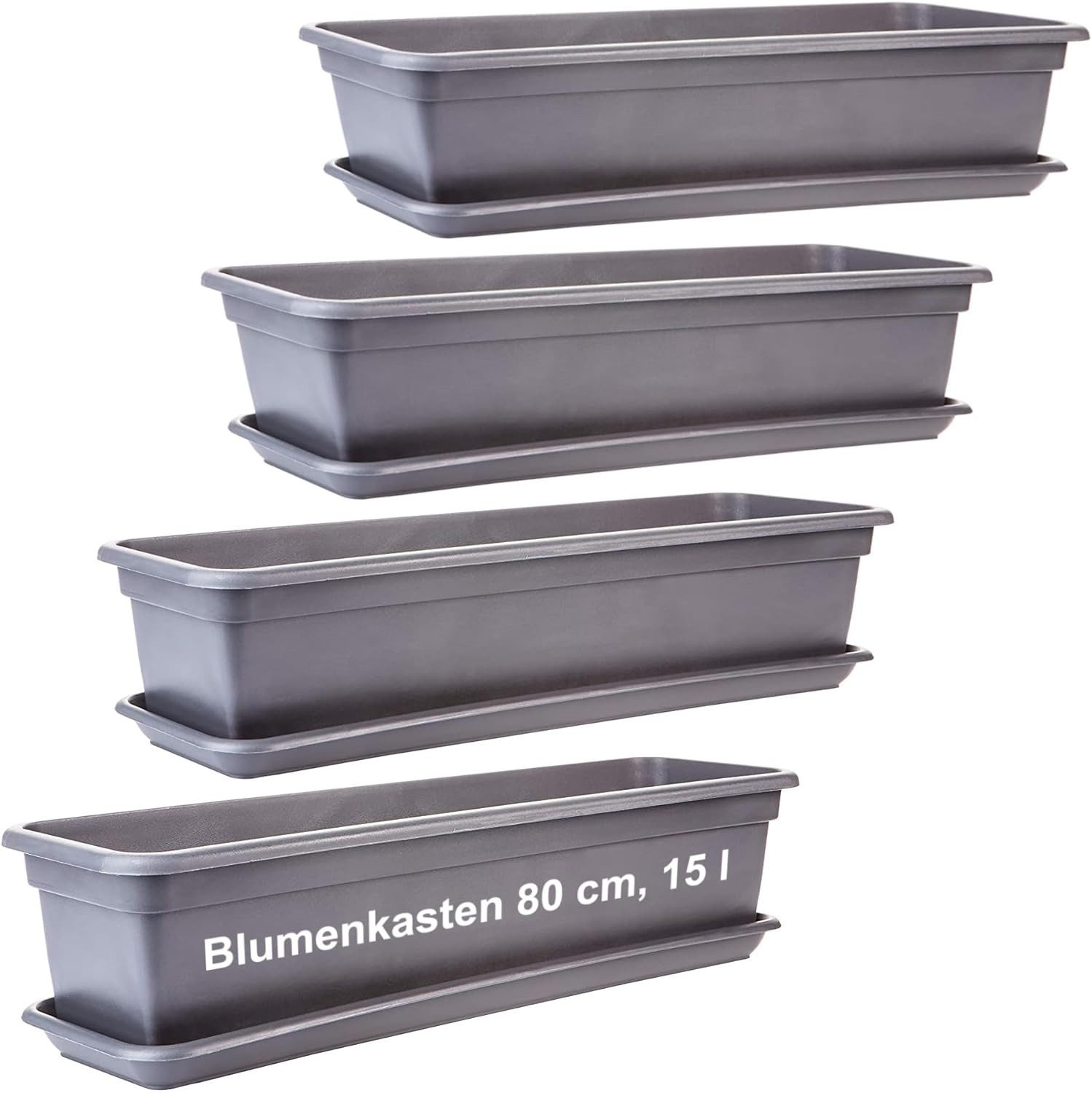 Lieferzustand | Lieferumfang: 4 Blumenkästen mit Untersetzer aus Kunststoff Anthrazit Maße 80T x 17B x 14H cm |