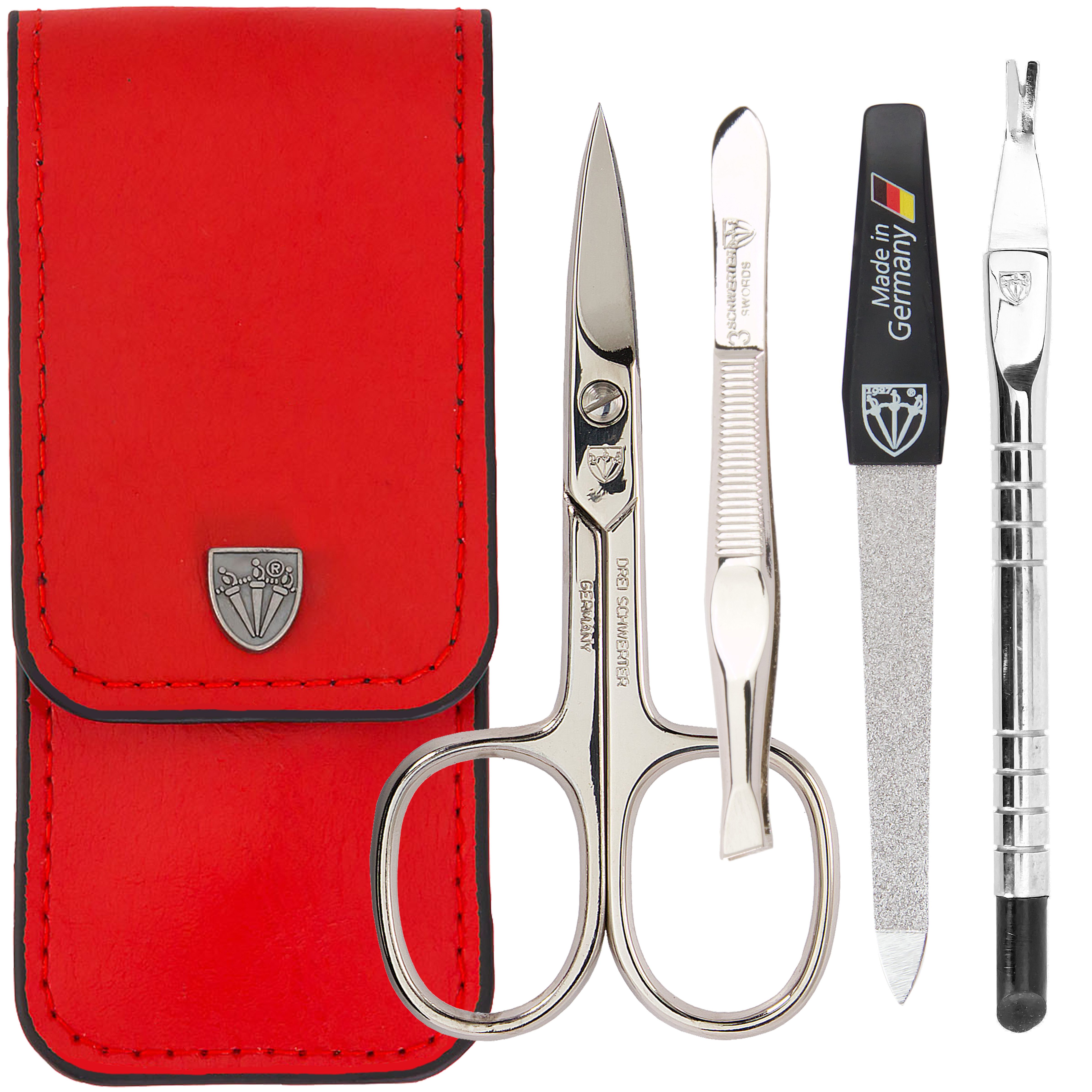 Jedes Instrument zeugt von der exzellenten Qualität, für die 3 SCHWERTER bekannt ist: Hochglanzvernickelte, polierte Stahlwerkzeuge garantieren Präzision bei jedem Schnitt und Feilenzug. Die Instrumente sind in einem eleganten Echtleder-Etui untergebracht, das mit seinem weichen Samtinnenfutter nicht nur Schutz bietet, sondern auch ein stilvolles Accessoire darstellt. Dank elastischer Halterungen sind die Werkzeuge sicher verstaut und dennoch leicht entnehmbar.