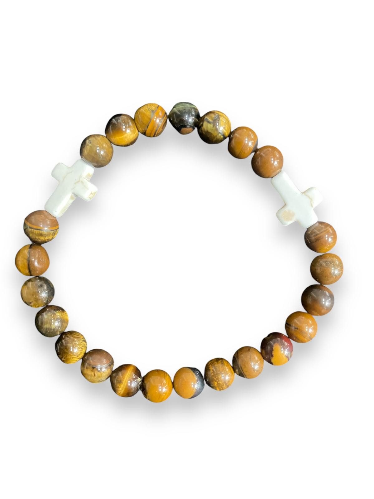 Dieses handgefertigte Tigerauge Edelstein Armband kombiniert natürliche Eleganz mit spiritueller Symbolik. Das Armband besteht aus 23 glänzenden Tigerauge-Perlen, die für Schutz, Klarheit und innere Stärke stehen. Die warmen, goldbraunen Töne des Tigerauges fangen das Licht auf faszinierende Weise ein und verleihen dem Armband eine edle Ausstrahlung. Besonders hervorzuheben sind die drei weißen Kreuze, die dem Armband einen einzigartigen und spirituellen Akzent verleihen. Die weißen Kreuze symbolisieren Reinheit, Frieden und göttlichen Schutz, was dieses Schmuckstück zu einem kraftvollen Begleiter im Alltag macht. Das elastische Band sorgt für einen angenehmen Tragekomfort und passt sich optimal dem Handgelenk an. Ein stilvolles Accessoire für jeden Anlass – sowohl für Männer als auch Frauen geeignet. Materialien: 23 Tigerauge-Perlen (Ø ca. 8 mm) 3 weiße Kreuze Eigenschaften: Symbolisiert Schutz, Klarheit und spirituelle Reinheit Elastisches Band für angenehmen Sitz Handgefertigt mit hochwertigen Materialien Verleihen Sie Ihrem Stil eine spirituelle Note mit diesem kraftvollen Tigerauge-Armband!