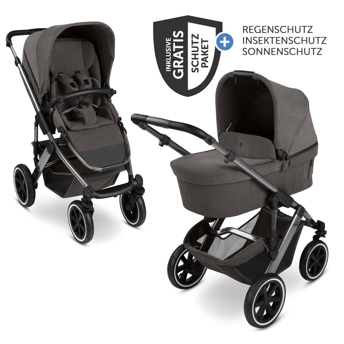 Ausstattung | Babywanne mit ergonomischer CozyCloud-Matratze, großem Sonnenverdeck & Quick-Fold-Funktion faltbare Babywanne mit zwei großen Lüftungsfenstern extra weiche, keilförmige Babywannen-Matratze mit erhöhtem Schutzrand Sportwagensitz flacher Liegeposition ausklappbares & erweiterbares Verdeck HappyBelt® mitwachsendes 5-Punkt-Gurtsystem weich gepolsterte Rückenlehne mit integriertem Belüftungsfenster Komfort-Sitzeinlage abnehmbarer Schutzbügel große & kugelgelagerte Lufträder zentrale Federung höhenverstellbarer Schieber inklusive Organizer verstellbare Rückenlehne |