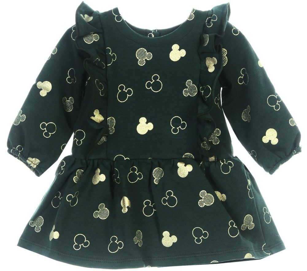 Edles Design: Baby-Kleid in Grün mit goldfarbenem Muster, festlich und stilvoll.