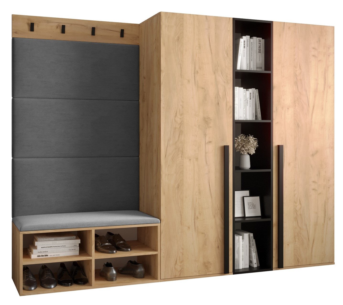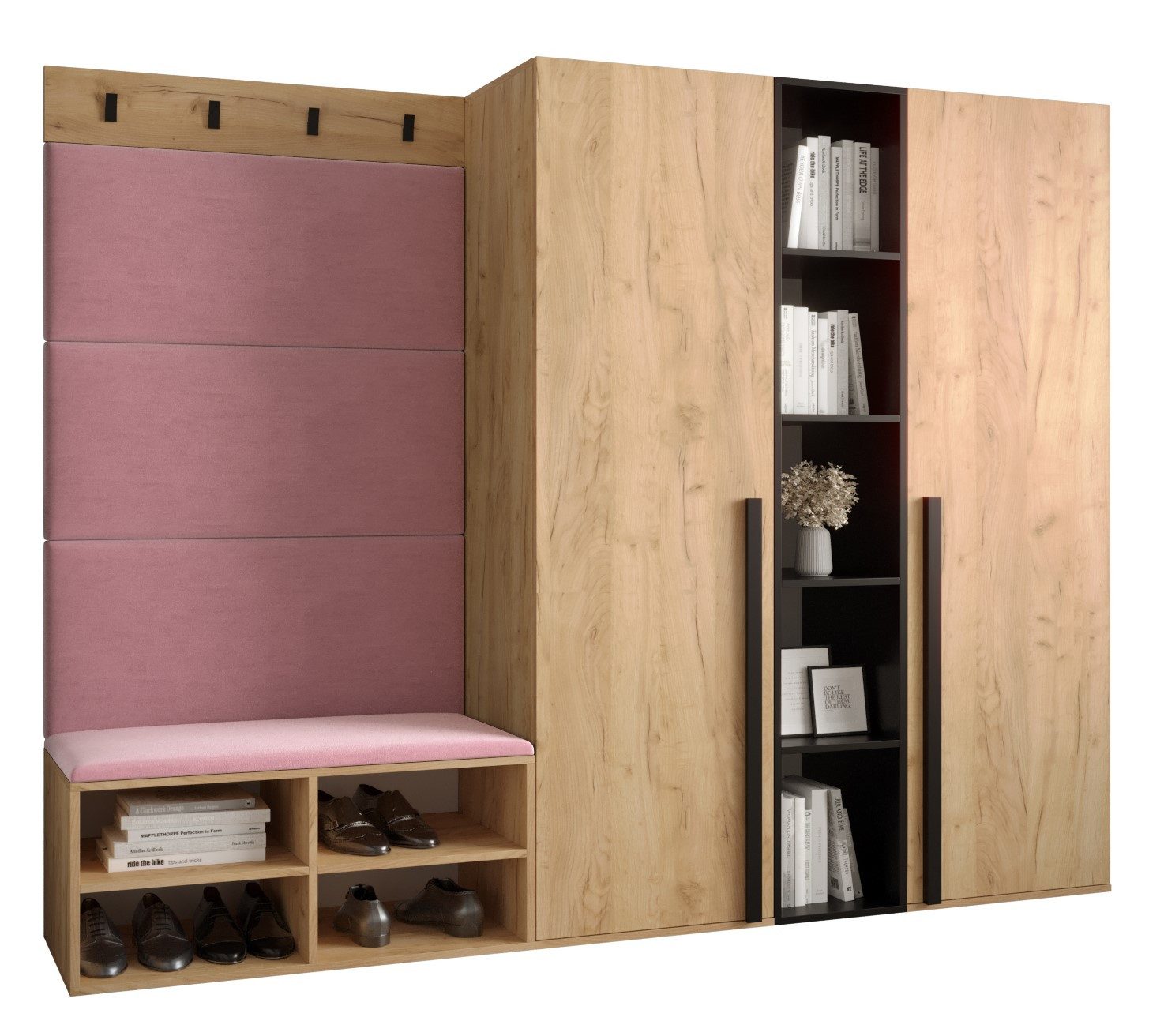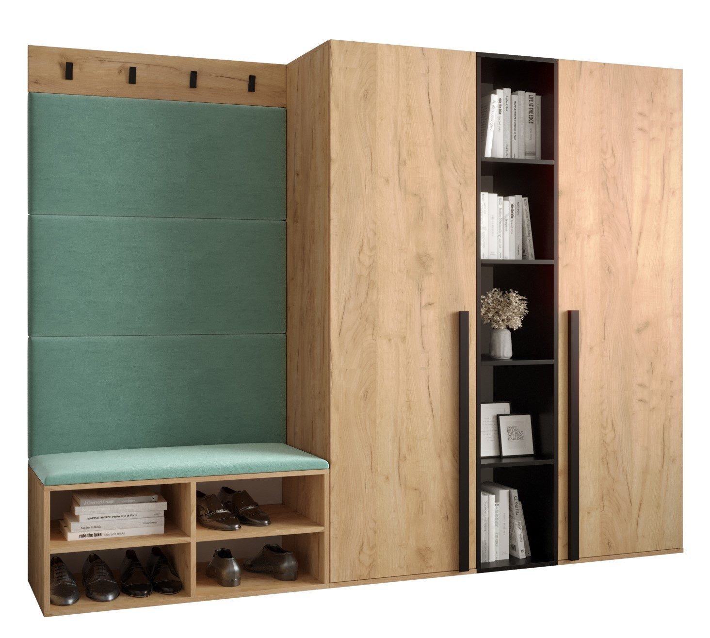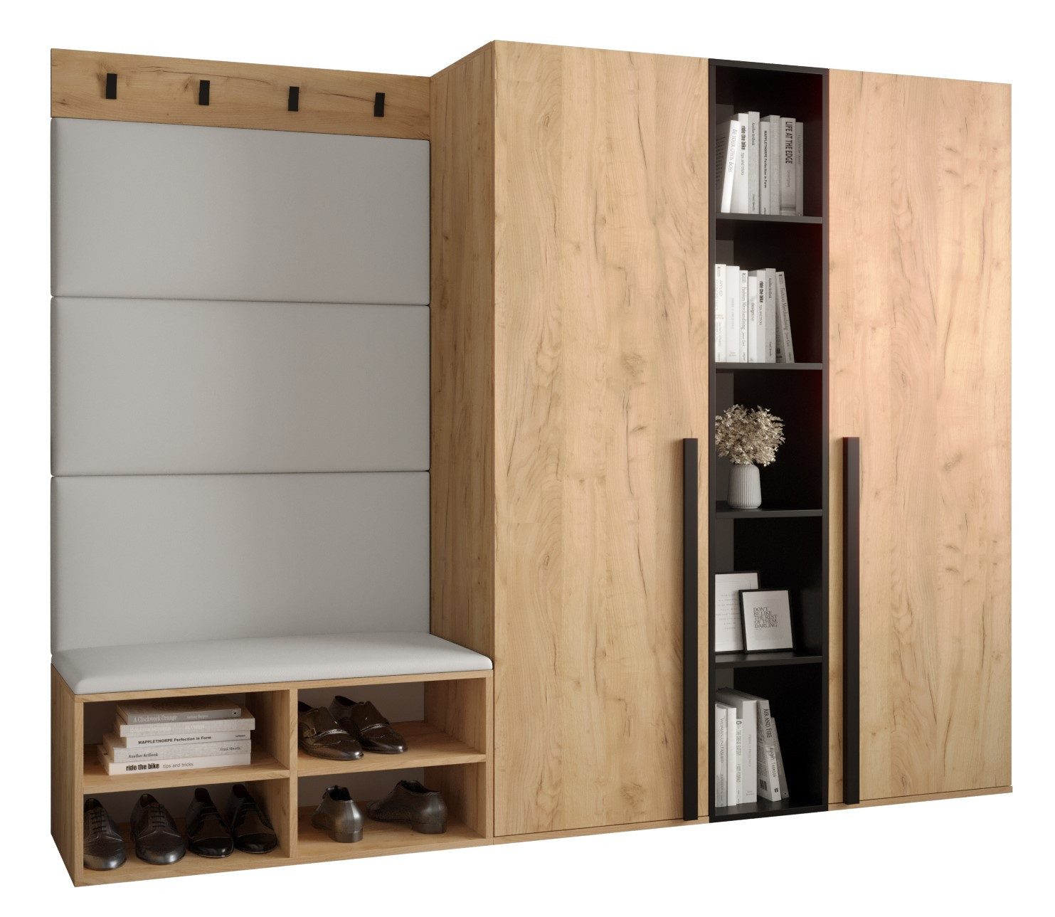 Viel Platz: Der MIRO-Garderobe ist ein Möbelstück im modernen Stil mit modischen Polsterpaneelen, eine große Anzahl von Regalen und Kleiderbügeln verleihen dem Kleiderschrank außergewöhnliche Funktionalität. Elegantes Design und eine große Auswahl an Paneelfarben ermöglichen es Ihnen, die Garderobe in Ihrem Flur frei zu gestalten!