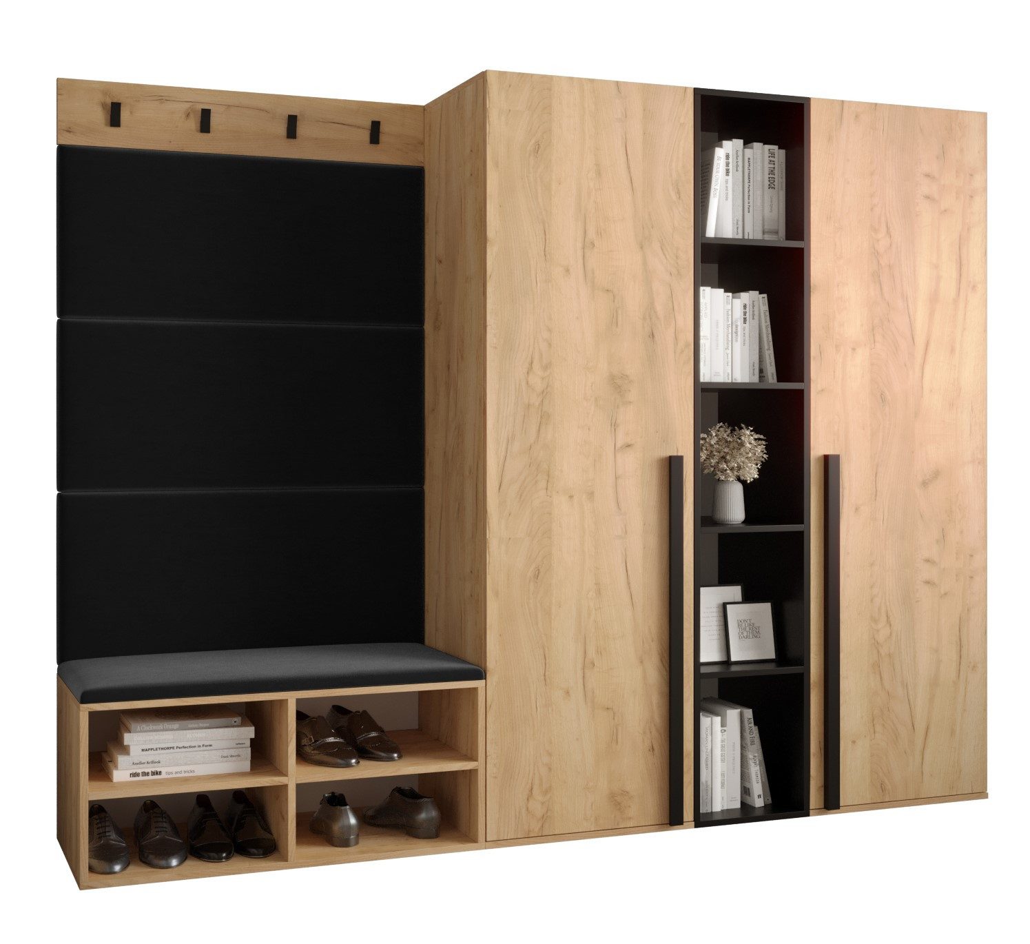 Technische Spezifikationen: Höhe: 184 cm, Breite: 214 cm, Tiefe: 42 cm. Erhältliche Farben des Korpus: Eiche Kraft Gold und Weiß. Farbe des Griffs: Mattschwarz.