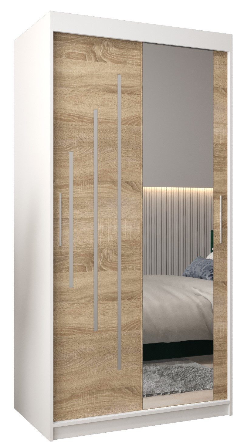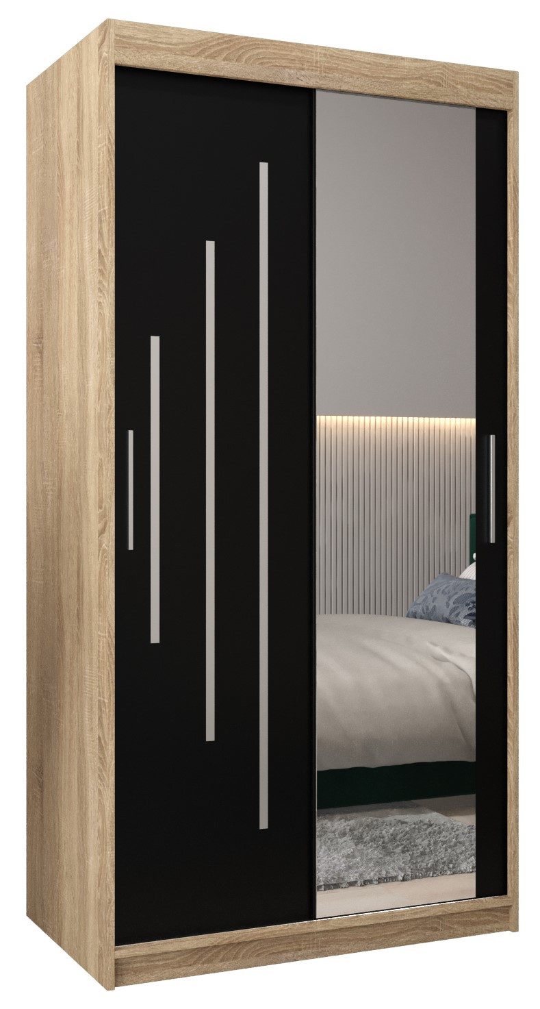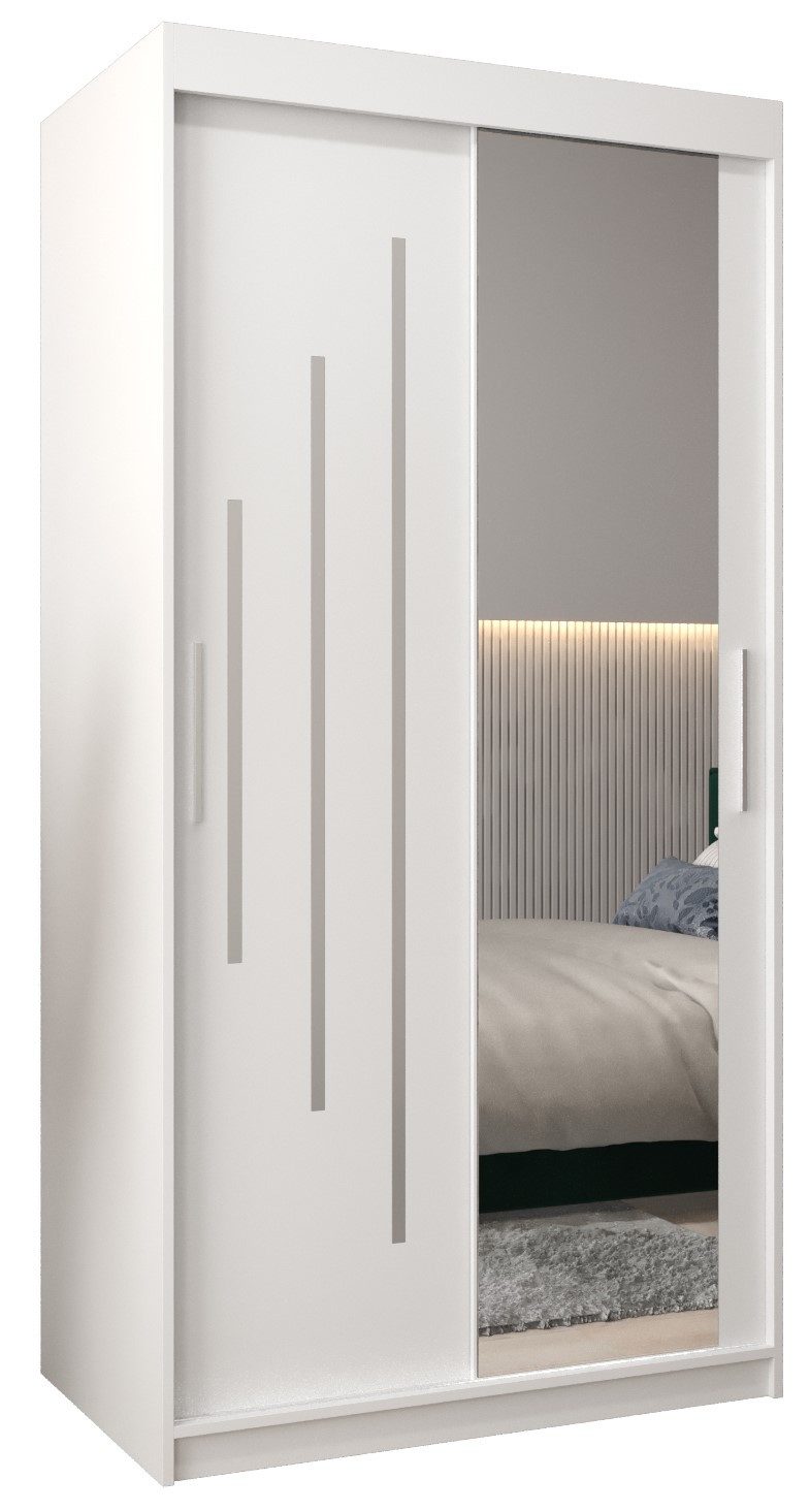Langlebige Materialien: Der Schrank besteht aus 16 mm dickem, massivem Laminat, während die Kanten sorgfältig mit langlebigem und beschädigungsbeständigem 0,5 mm starkem PVC-Furnier versehen wurden. Die Vorderseite ist mit einem polierten Spiegel versehen und die Griffe sind aus Kunststoff. Die Zierstreifen zur Selbstklebung. Der Schrank ist mit Schiebetüren auf Aluminiumschienen ausgestattet.