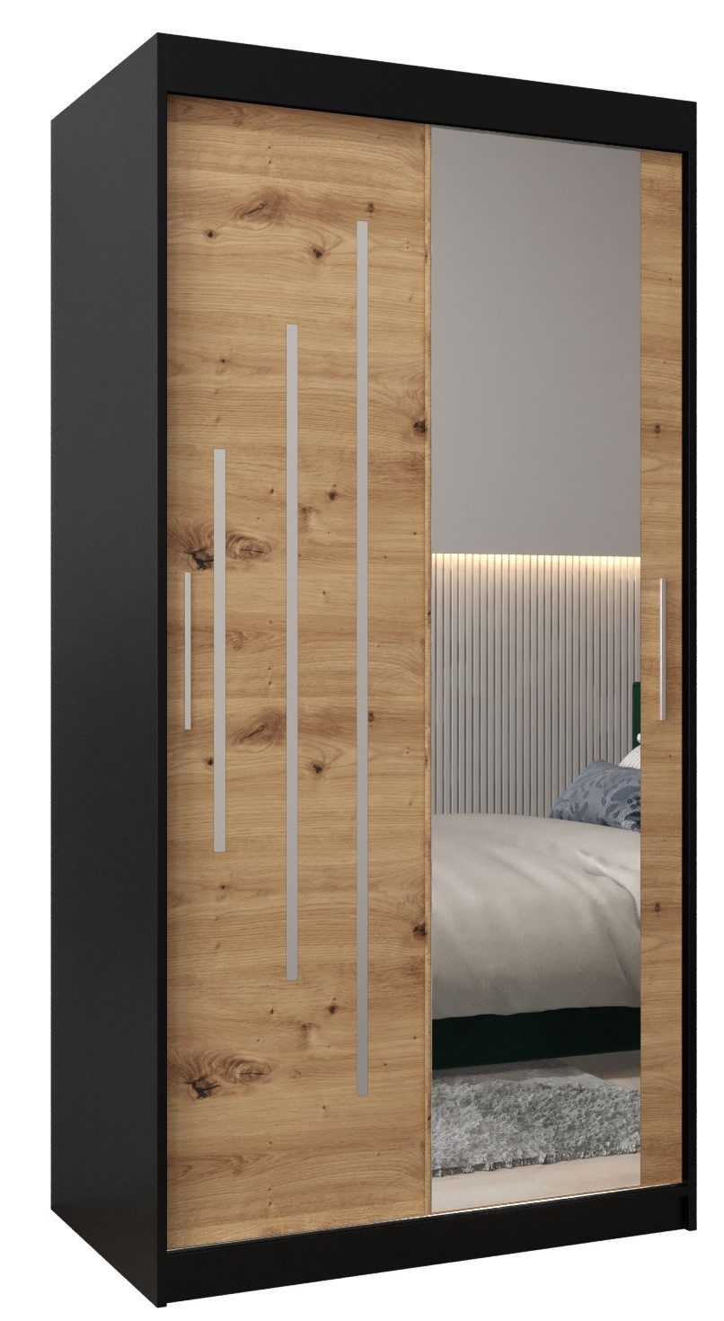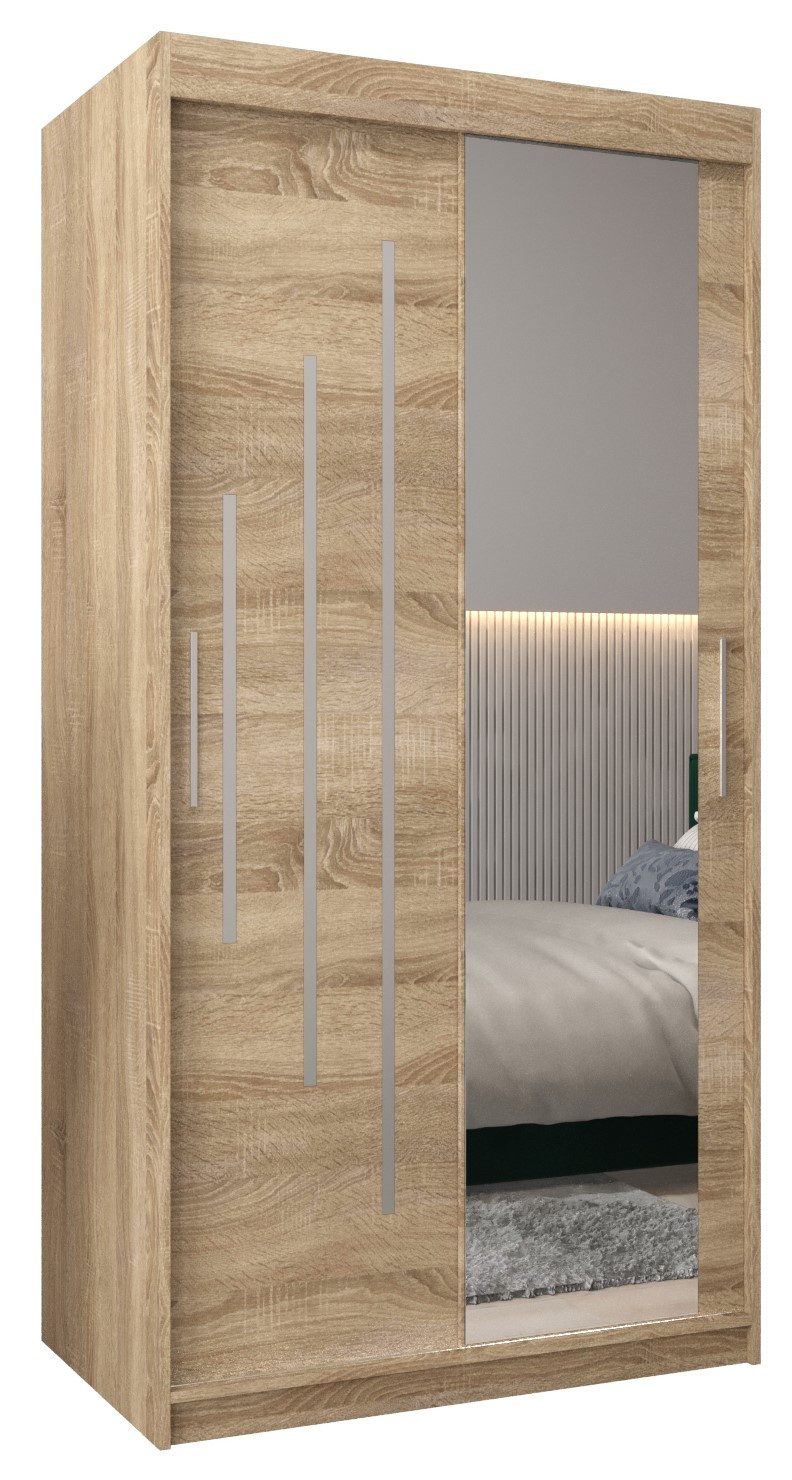 Produktparameter: Schrankmaße: Breite 100/120/150/180/200/250, Höhe 200/240 cm, Tiefe 62 cm. Türtyp: Schiebetür. Kleiderschrank mit Spiegel. Material: Korpus und Front aus 16 mm dickem Laminat, Aluminiumführungen, Metallstangen, Kunststoffgriffe, Kanten aus 0,5 mm starkem PVC-Furnier.