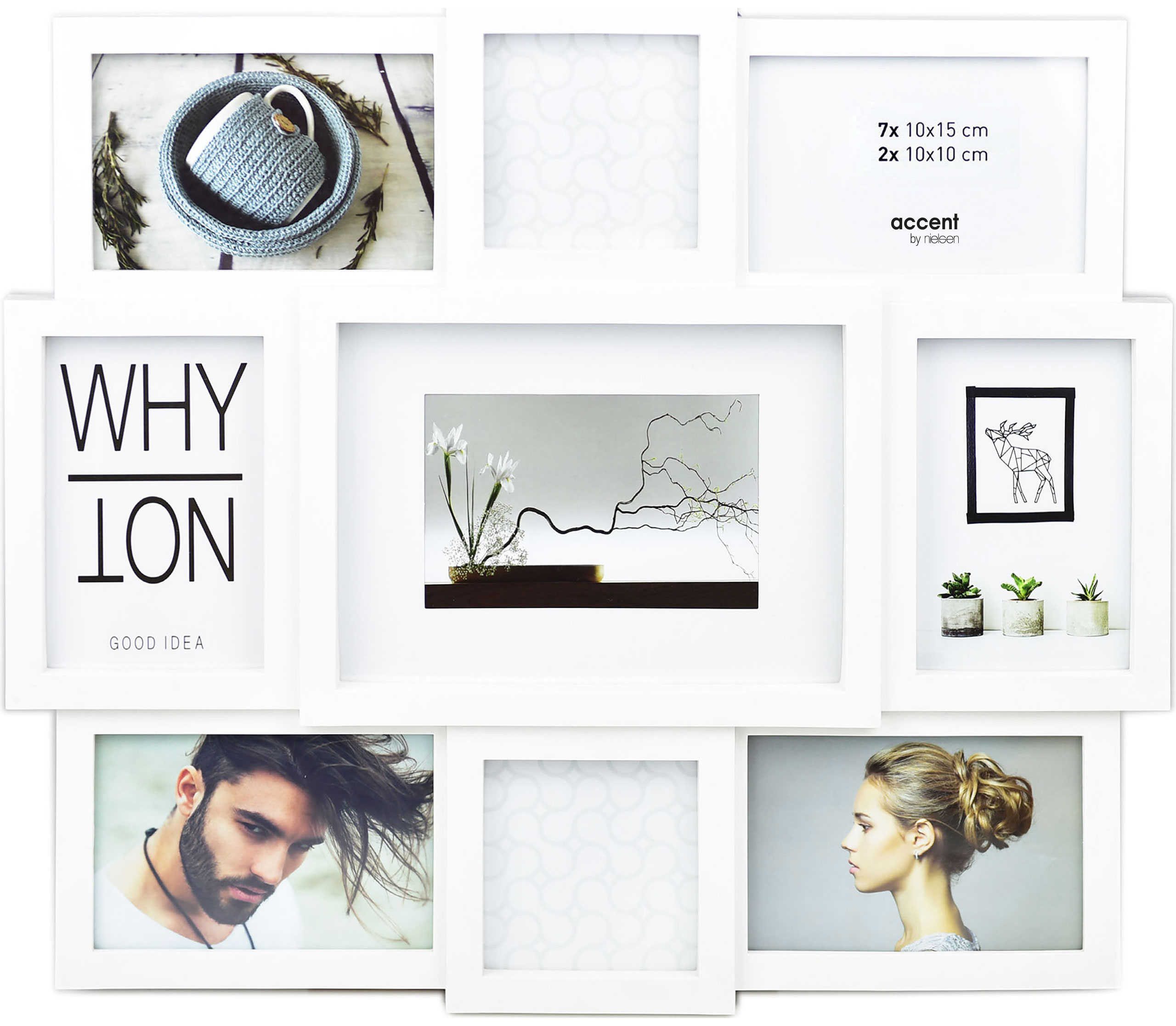 Die WhyNot-Collage ermöglicht es Ihnen, sieben Fotos im Format 10x15 cm sowie zwei Fotos in 10x10 cm einzurahmen. Die ansprechende 3D-Optik verleiht der Collage eine besondere Note. Dank des einteiligen Designs sind keine Gehrungen sichtbar. Die Rückwand ist mit Drehfedern ausgestattet, wodurch ein einfacher und schneller Motivwechsel gewährleistet ist.
