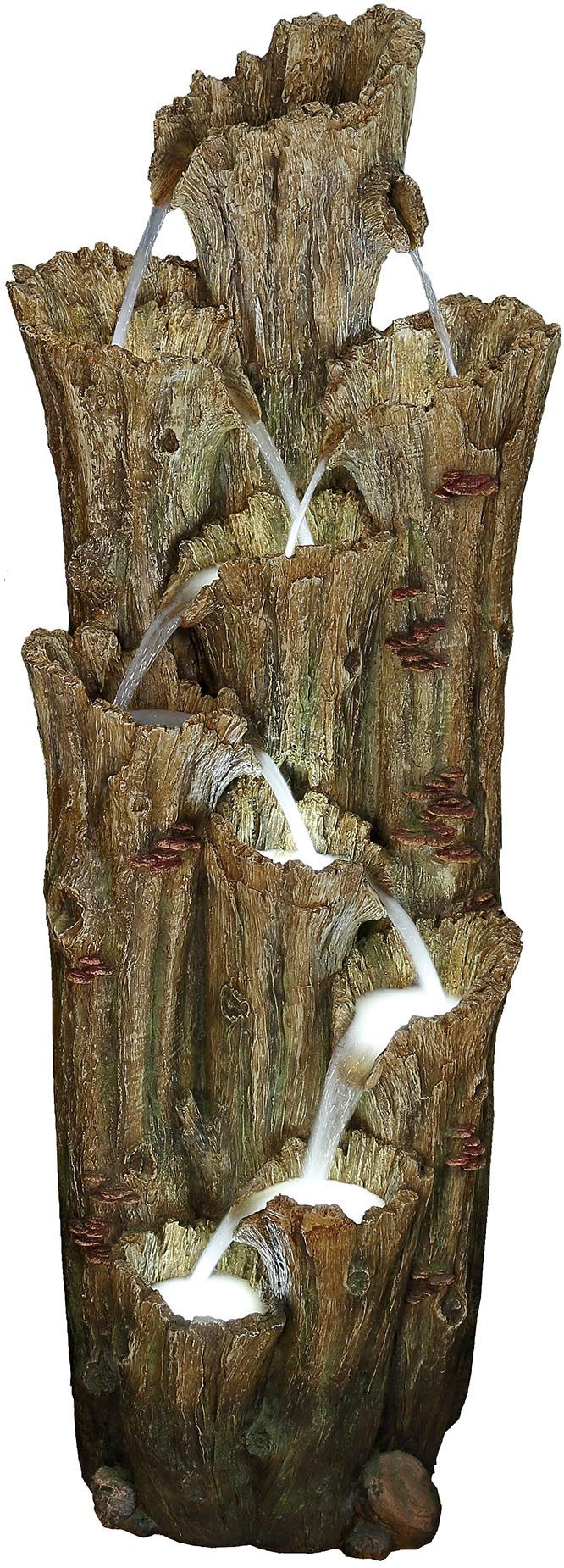 Imposante Kaskade in der Optik alter Baumstämme in unterschiedlicher Höhe. Aus den Kronen ergießen sich kleine Wasserfälle, die von Stamm zu Stamm fließen und von kleinen LEDs beleuchtet werden. Leichtes, wetterfestes Material mit integriertem Wasserreservoir. Komplettset mit passender Pumpe für die optimale Wasserzirkulation. Eine wunderschöne Dekoration für den Garten.