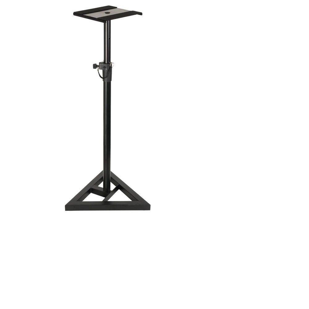 Dreieckiger Fuß aus 35mm-Vierkantrohr, Stellfläche 450 x 390 mm. Ständerrohr Ø 40 / 35 mm, höhenverstellbar von 91,5 - 150 cm, mit Knebelschraube feststellbar. Bei schweren Lautsprechern kann der Ständer mit dem mitgelieferten Sicherungsstift in den Stufen 102 - 114 - 126 - 138 - 150 arretiert werden.