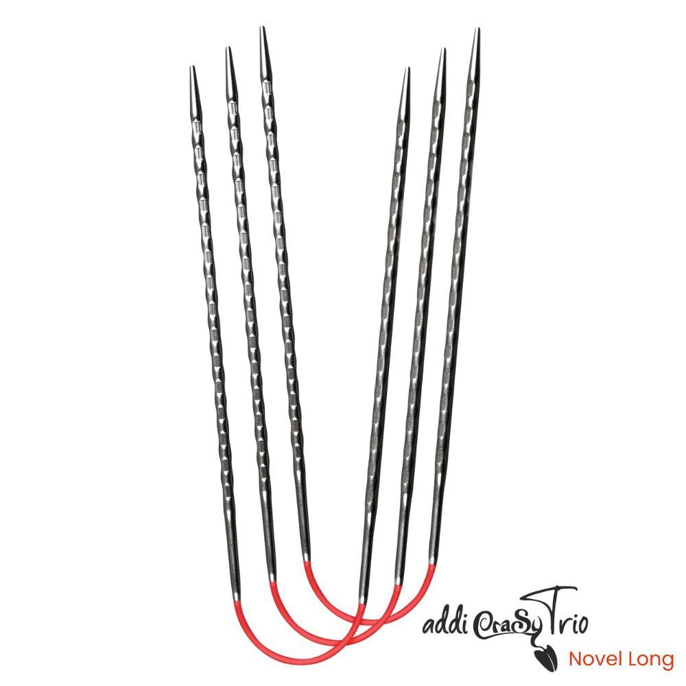 Mit dem addiCraSyTrio Novel LONG bringst du dein Strickerlebnis auf ein neues Level! Das innovative 3er-Set ermöglicht ein besonders ergonomisches Arbeiten und eignet sich perfekt für kleine Durchmesser – ideal für Socken, Handschuhe oder Ärmel. Dank der flexiblen Seilmitte passen sich die Nadeln optimal deiner Hand an, während das viereckige Design mit strukturierter Oberfläche für besseren Halt sorgt.