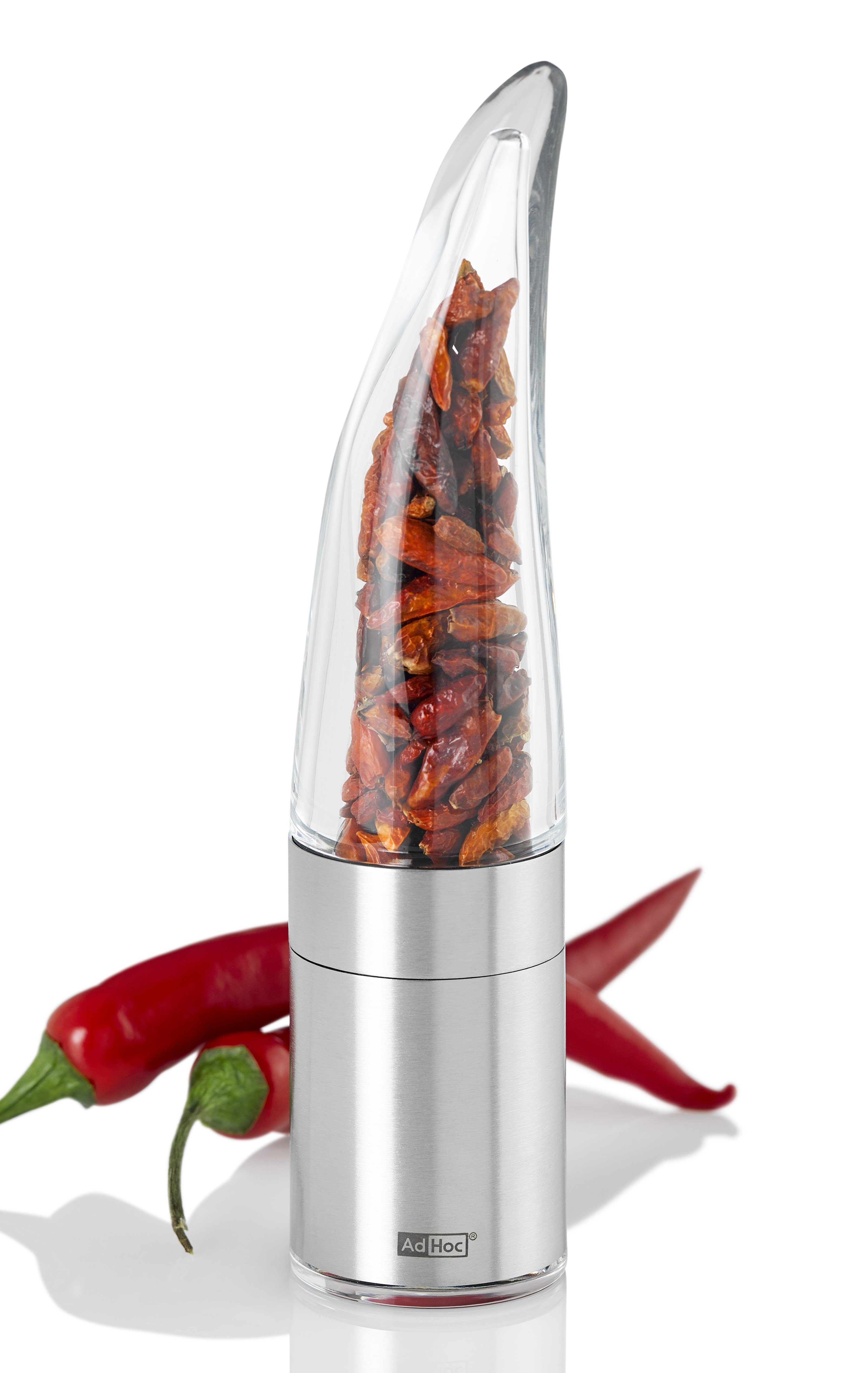 PEPE ist der innovative Chilischneider von AdHoc. Die individuelle Gestaltung lässt sofort die Funktion erkennen: „For Chilies only!“ Das elegante Acryl-Edelstahl-Design, für den freien Blick auf die Chilis, macht PEPE zum echten Eye-Catcher auf dem Tisch. Er verfügt über das patentgeschützte original AdHoc SchneidWerk®, das für das optimale Zerkleinern von getrockneten Chilis samt Kerne ausgerichtet ist. Durch die feine Dosierung führt der Umgang mit Chilis zu keinen unliebsamen Überraschungen mehr. Die Aromaschutzkappe sorgt dafür, dass das geschnittene Chilipulver letztendlich nur dahin kommt, wo Sie es wirklich hin haben möchten, nämlich auf die zu würzende Speise.
