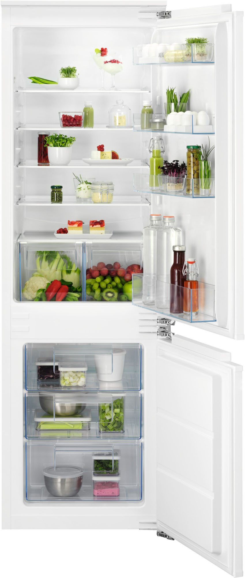 Die Einbaukühlgefrierkombination »TSC5S183DF« von AEG hat eine hohe Funktionalität und ist integrierbar. Bei einem Gefriervolumen von 73 l und Kühlvolumen von 189 l betragen die Maße des Modells 55,7 x 176,9 x 54,9 cm (B/H/T). Das Modell arbeitet mit einem Betriebsgeräusch von 34 dB. Regelmäßiges Abtauen ist mit der LowFrost-Technologie einfacher – es bildet sich erheblich weniger Eis als bei herkömmlichen Geräten, daher gelingt mit geringem Stromverbrauch das Abtauen deutlich schneller. Es sind drei Gefrierschubladen und zwei Gemüseschubladen zum Verstauen des Einkaufs integriert. Das innen installierte Display zeigt die genaue Temperatur im Gerät an. Auf fünf Ablageflächen aus Glas, davon vier höhenverstellbar, ist in der Einbaukühlgefrierkombination viel Platz für Lebensmittel. Schnell griffbereit sind Lebensmittel in den vier Türablagen. Durch die Frostmatic- und Schnellgefrier-Funktionen lassen sich Nahrungsmittel besonders schnell kühlen und einfrieren. Den Überblick behält man außerdem dank der LED-Innenbeleuchtung. Wer auf der Suche ist nach einem Gerät, das ausreichend Platz für Nahrungsmittel bietet, der trifft mit der »TSC5S183DF« von AEG eine gute Wahl.