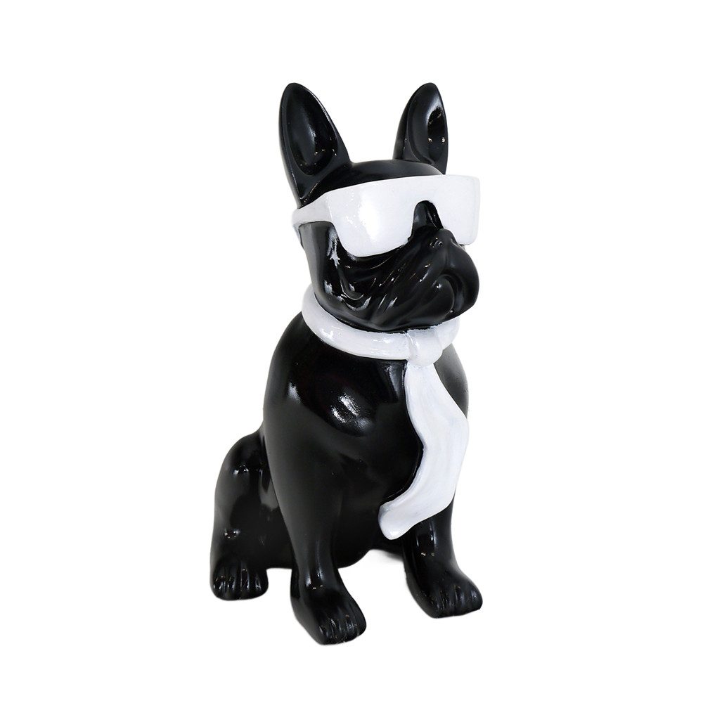 Dekorative französische Bulldogge mit Sonnenbrille und Schal aus Kunstharz (Resin) gefertigt.