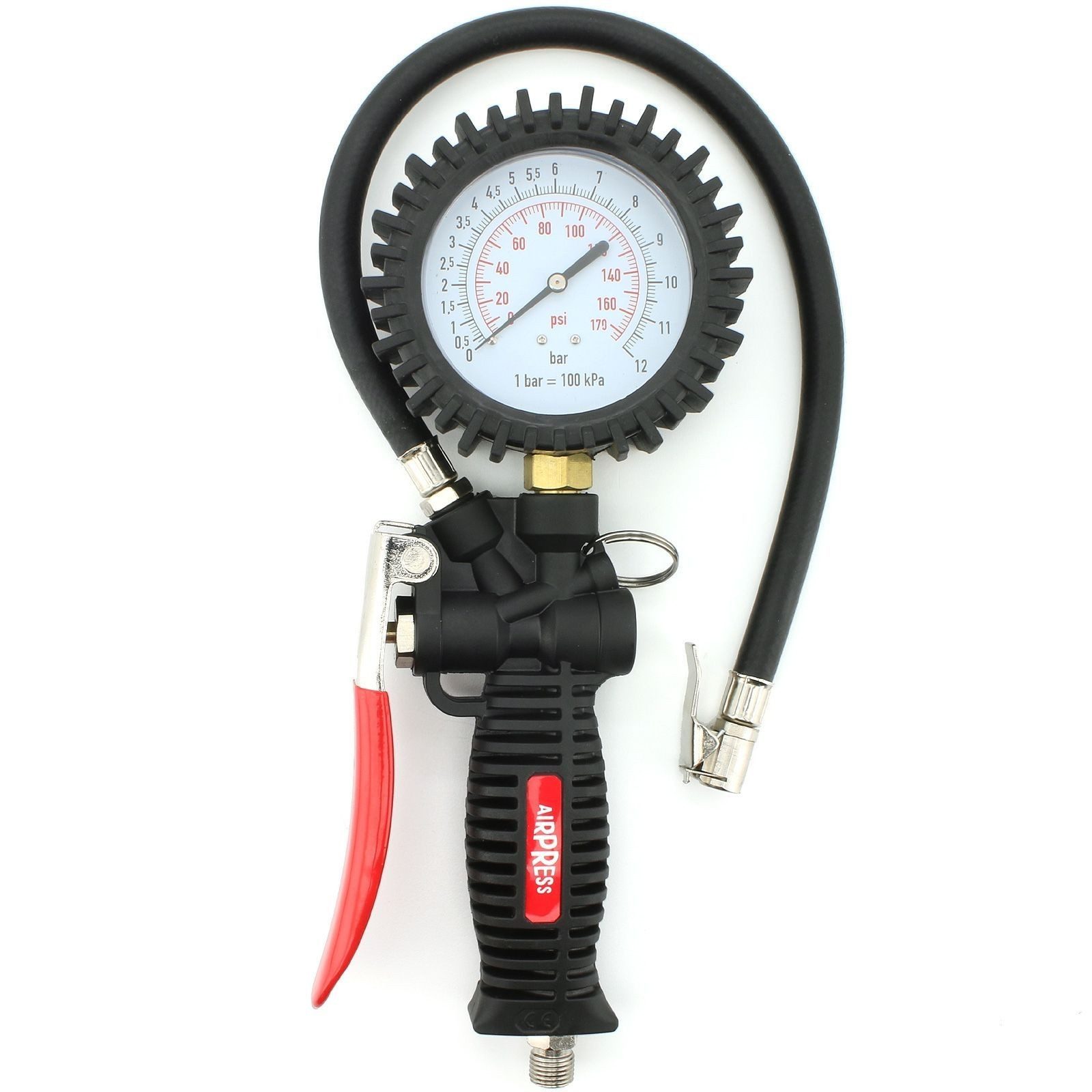 Hochwertiges Reifendruckfüllgerät zum genauen Messen, Auffüllen und Ablassen des Reifendrucks bis max. 12 bar. Die robuste Reifendruckpistole ist stoßfest und eignet sich optimal für den harten Einsatz in Werkstatt, Garage oder zu Hause. Geeignet für fast alle Reifentypen.