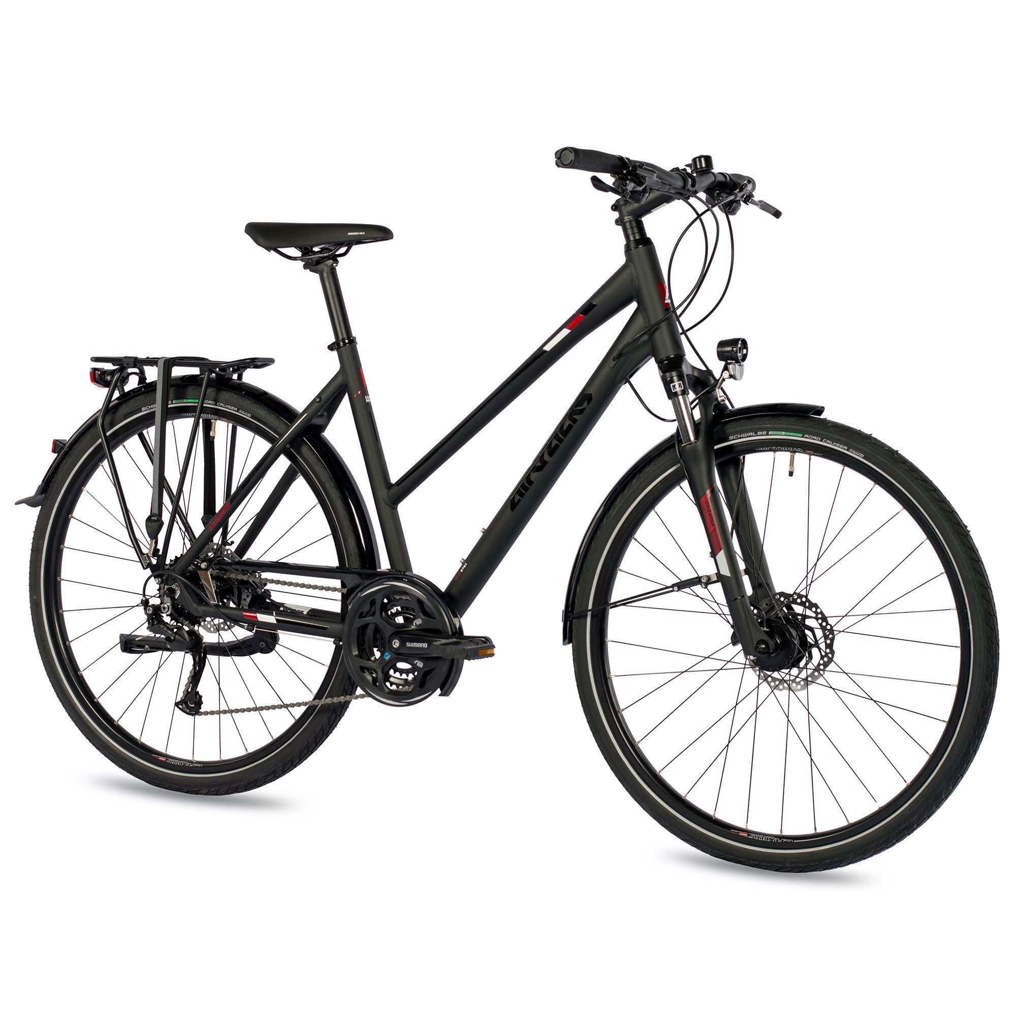 Die leistungsstarke Beleuchtungsset von Axa betrieben durch den Nabendynamo von Shimano sorgen dafür, dass man sieht und gesehen wird.