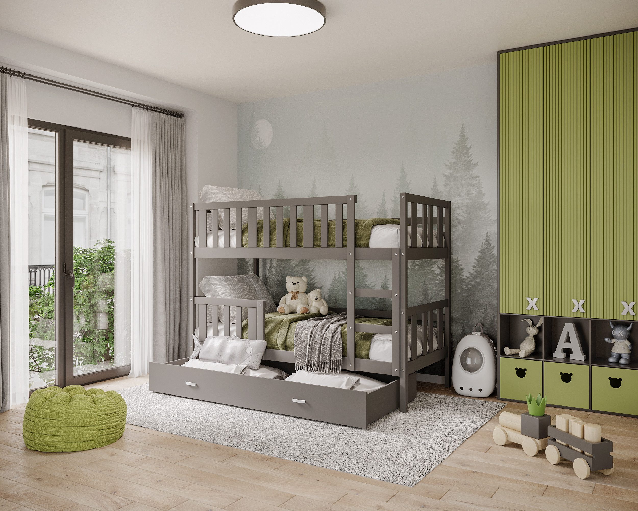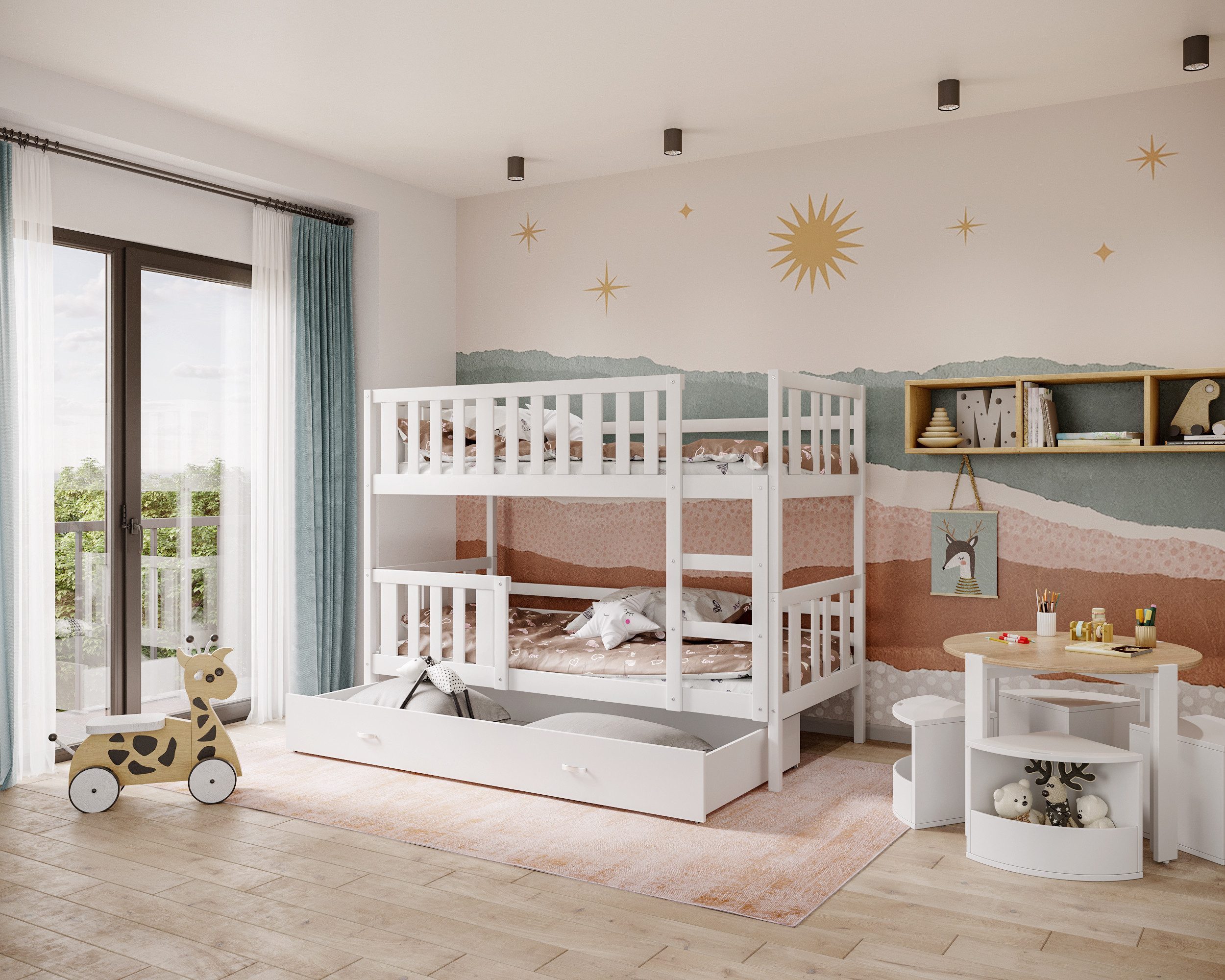 Das AJKmeble Hochbett/Etagenbett bietet eine stilvolle und funktionale Schlaflösung für zwei Kinder. Verfügbar in den Farben Grau, Weiß oder Natur, fügt sich das Bett harmonisch in jedes Kinderzimmer ein. Dieses Stockbett ist mit einer großen Schublade für zusätzlichen Stauraum ausgestattet und bietet Sicherheit durch den integrierten Rausfallschutz. Eine stabile Leiter ermöglicht den einfachen Zugang zum oberen Bett. Hergestellt aus robustem Material, ist dieses Hochbett perfekt für Jungen und Mädchen geeignet und sorgt für ein gemütliches und sicheres Schlafumfeld.