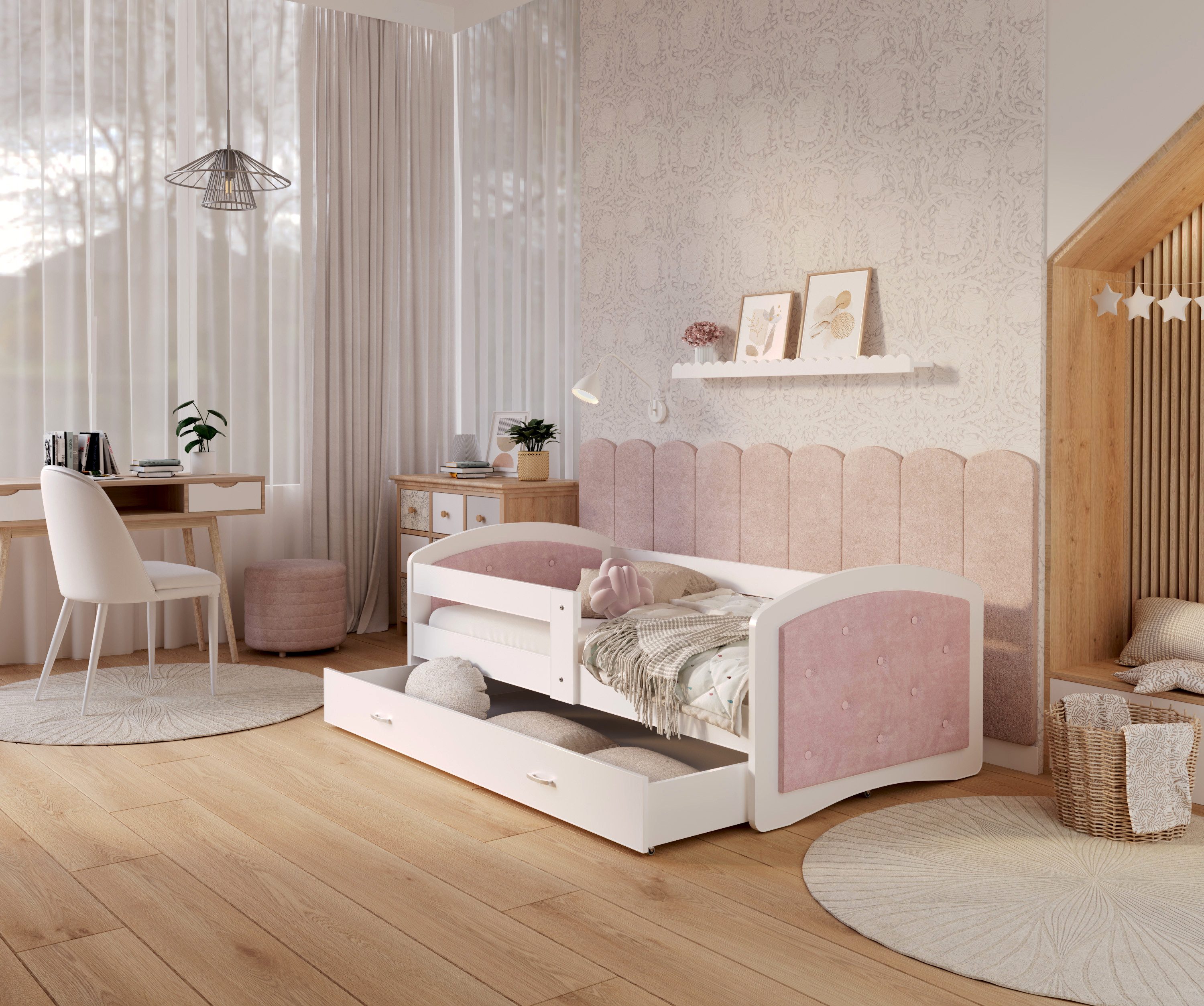Das AJKmeble Jugendbett kombiniert Stil, Komfort und Sicherheit und ist die perfekte Wahl für das Kinderzimmer. Dieses gepolsterte Bett ist in den Größen 80x160 cm, 80x180 cm und 90x200 cm erhältlich und bietet damit die ideale Schlaflösung für Jungen und Mädchen. Die Polsterung in den Farben Weiß, Rosa und Grau verleiht dem Bett eine elegante Note und sorgt für zusätzlichen Komfort. Der integrierte Rausfallschutz bietet Sicherheit während des Schlafs, und der Lattenrost ist im Lieferumfang enthalten. Hergestellt aus hochwertigem MDF-Holz in Europa, überzeugt das Bett durch seine Langlebigkeit und Stabilität.