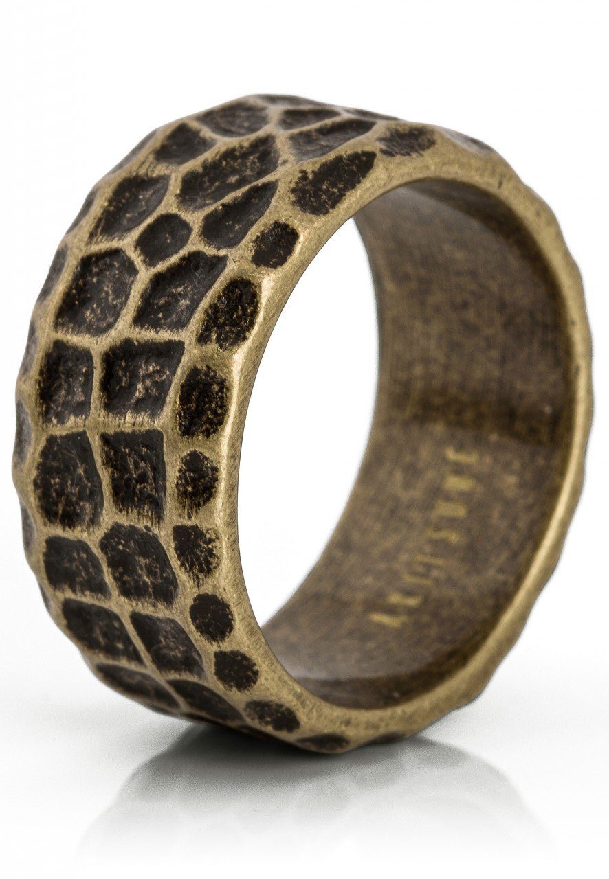 Dieser gehämmerte Stahlbandring ist ein Tribute an die Erde, auf der wir stehen, und an ihren fruchtbaren Boden. • Edelstahl • Farbe: Messing