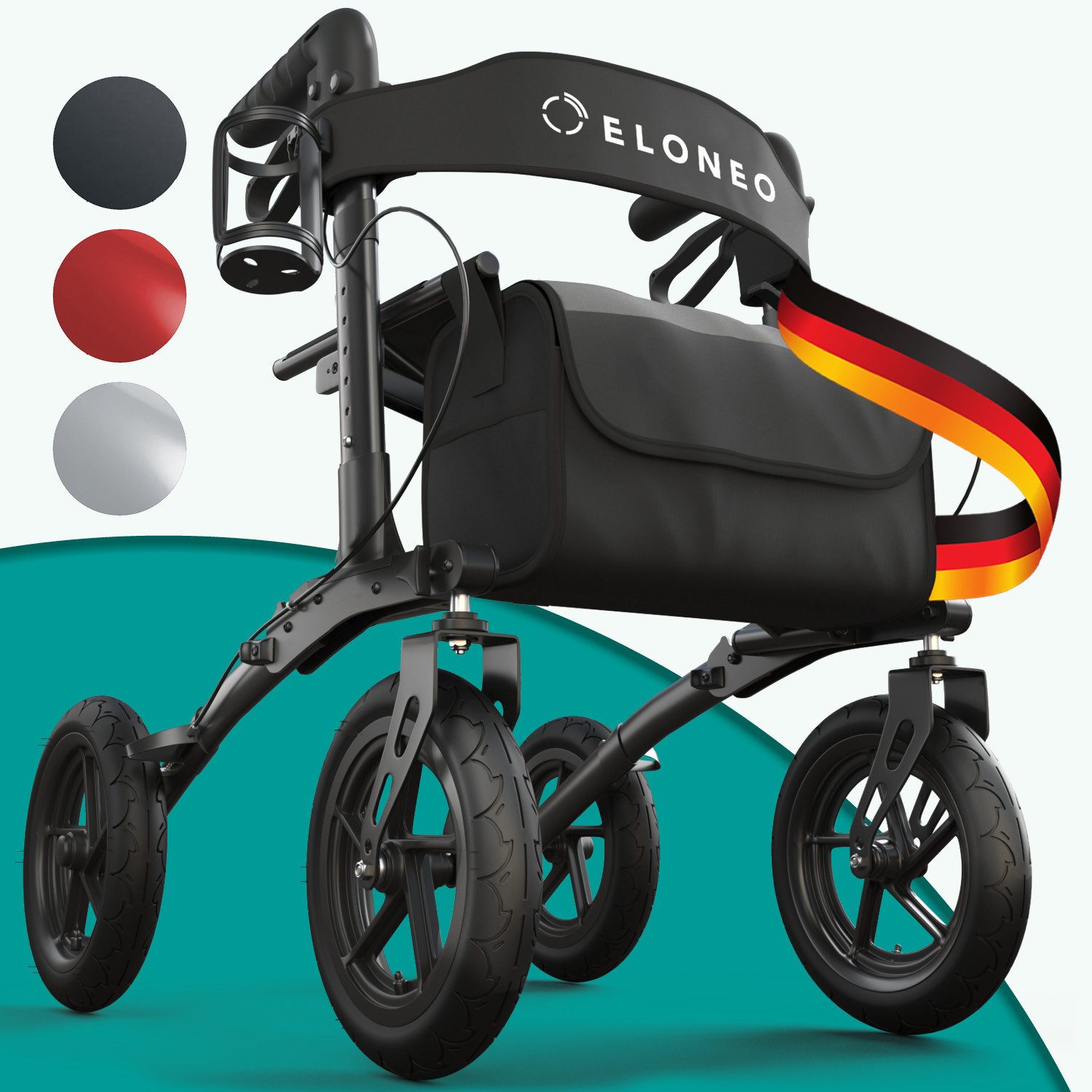 Ausstattung | großer Sitz komfortabler Rückengurt Einkaufstasche Ankipphilfe ergonomische Griffe Feststellbremse Reflektoren Gehstockhalter |