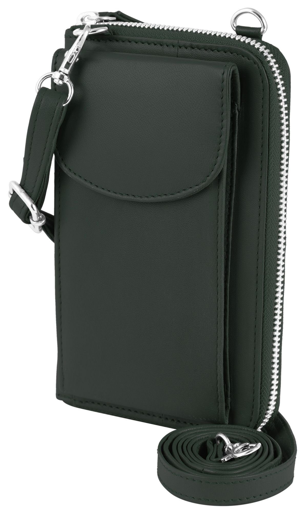 Die Handyumhängetasche mit Geldbörse der Marke Akzent ist aus Echtleder gefertigt. Sie ist für viele Freizeitaktivitäten bestens geeignet und kann das mühselige Tragen einer großen Handtasche ersetzen. Sie verfügt über 6 Kreditkartenfächer, 2 Geldscheinfächer und 1 Reißverschlussfach für das Kleingeld. Öffnen und schließen lässt sich das Portemonnaie mit einem Reißverschluss im äußeren Bereich. Die Handytasche lässt sich separat mit Hilfe eines Druckknopfes mühelos öffnen und schließen. Die Размер der Handyumhängetasche ergibt sich aus einer Длина von 19,5 cm, einer Breite von 12 cm und einer Stärke von 4 cm. Diese bietet genug Stauraum um alles Wichtige übersichtlich zu verstauen und ist auch für große Handys, wie zum Beispiel das iPhone 15, iPhone 15 Pro und iPhone 15 Pro Max geeignet. Der Umhängegurt besteht ebenfalls aus Echtleder und hat eine maximale Длина von 140 cm. Zudem ist er verstellbar und abnehmbar. Diese Tasche sieht nicht nur cool aus, sie ist auch ein super praktischer Begleiter in vielen Alltagssituationen.