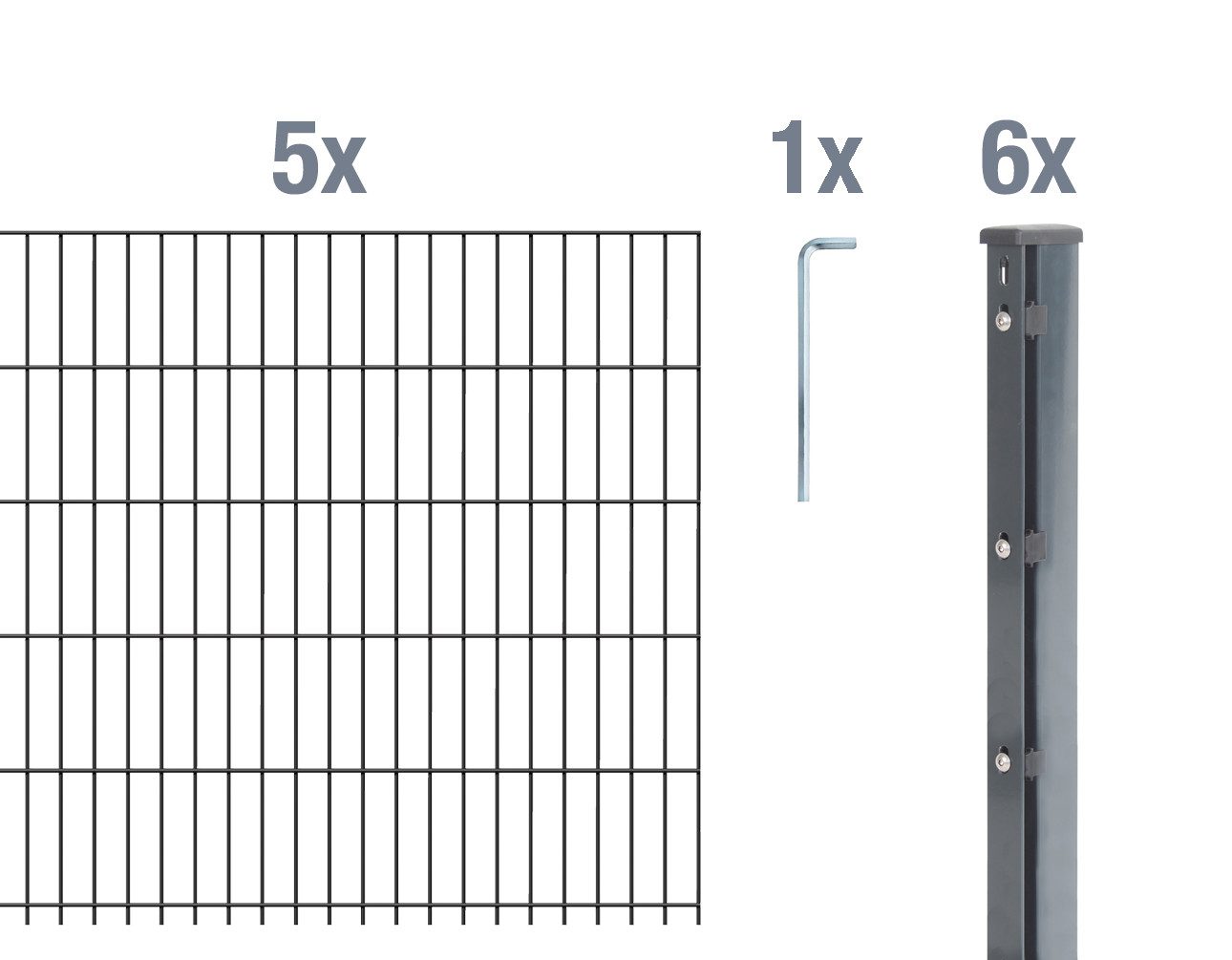 • Dieses Doppelstab-Zaunset beinhaltet folgende Bestandteile: 5 x Doppelstabmatte, 6 x Zaunpfosten, 1 x Innensechskantschlüssel.