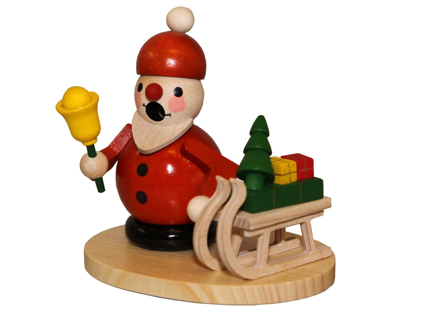 Räuchermann Ruprecht mit Schlitten Dieser schöne Räuchermann hat eine Размер von 9,5 cm. Die Figur steht frei und hat eine Funktion für normale Räucherkerzen. Der Ruprecht hält in der Hand eine Glocke. Daneben steht sein Schlitten mit Geschenken. Er ist komplett aus Holz gefertigt. Der Boden lässt sich abnehmen und darauf komm die Räucherkerze. Всеs wird in verschiedenen Arbeitsschritten komplett in Seiffen in einem Familienbetrieb mit langer Tradition gefertigt. Die Figur ist farbig gestaltet der Sockel natur BxHxt 9,5x9,5x7cm NEU |