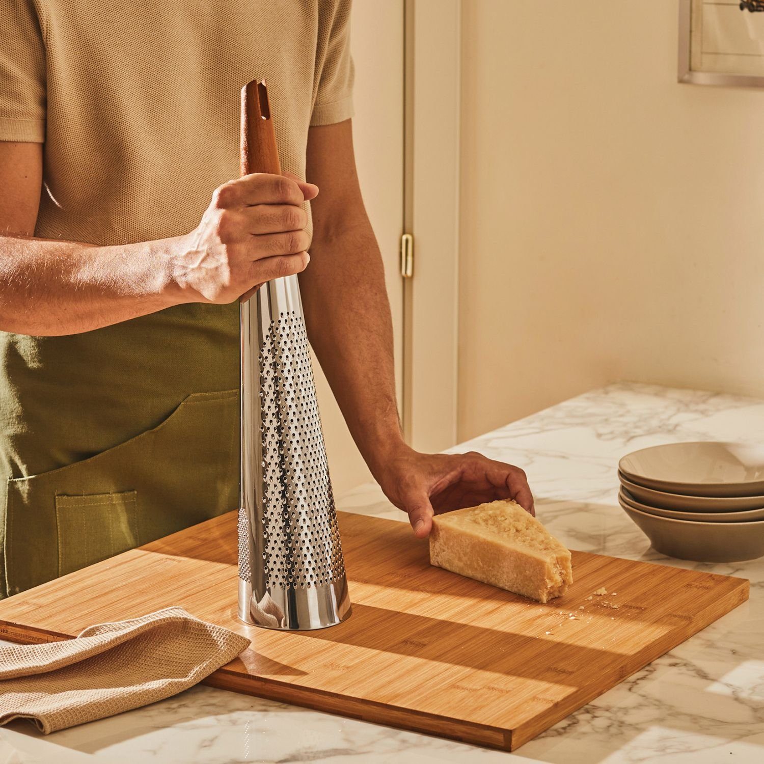 besonders große Käsereibe aus Edelstahl mit Griff aus Holz