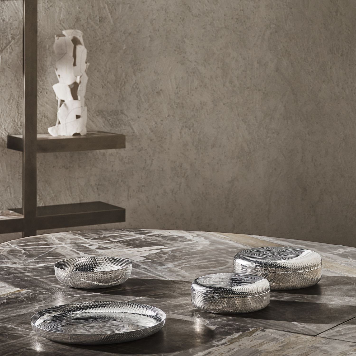 Alessi erfindet mit der Serie Extra Ordinary Texture die antike Technik der Granulation neu, für die vor allem die Etrusker aus dem heutigen Mittelitalien weltberühmt waren. Bei dieser Art der Metallverarbeitung werden kleine Kügelchen auf ein Metallblech gelötet, so entstehen Ornamente und geometrische Muster, die dem jeweiligen Objekt eine stark plastische Wirkung verleihen. Das granulierte Motiv auf der silberfarbenen Schale ist im goldenen Schnitt angeordnet, was der gleichmäßigen Reliefoberfläche eine besondere Harmonie verleiht. In der schlichten Schale mit einem Durchmesser von 24 cm können nicht nur Lebensmittel, sondern auch kleine Andenken, Schmuck und andere Accessoires stilvoll aufbewahrt werden. Die vielseitige Schale aus glänzendem Edelstahl kann bei Bedarf auch in der Spülmaschine gereinigt werden.