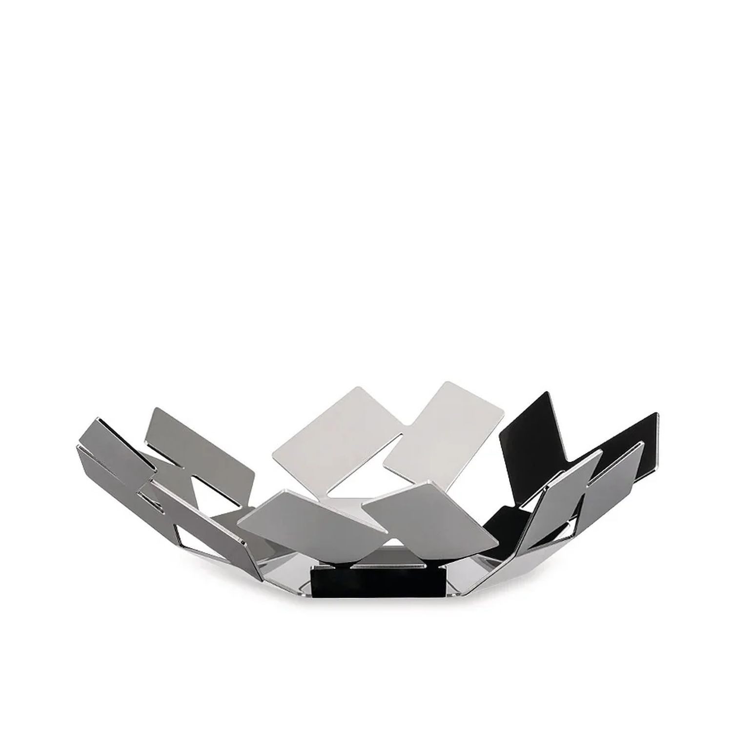 Die einzigartige Form der Obstschale La Stanza dello Scirocco soll an vom Wind durcheinandergewirbelte Papierstücke erinnern. Inspiriert wurde der Designer Mario Trimarchi von der stillen und nachdenklichen Atmosphäre der großen Landhäuser Siziliens, in die er sich vor dem gefürchteten Scirocco-Wind geflüchtet hatte. Die scheinbar fragile Konstruktion aus glänzend polierten Edelstahlplatten hat einen Durchmesser von 24,5 cm und ist 6,2 cm hoch. In ihr finden nicht nur Obst, sondern auch Gemüse und kleine Wohnaccessoires einen dekorativen Platz.