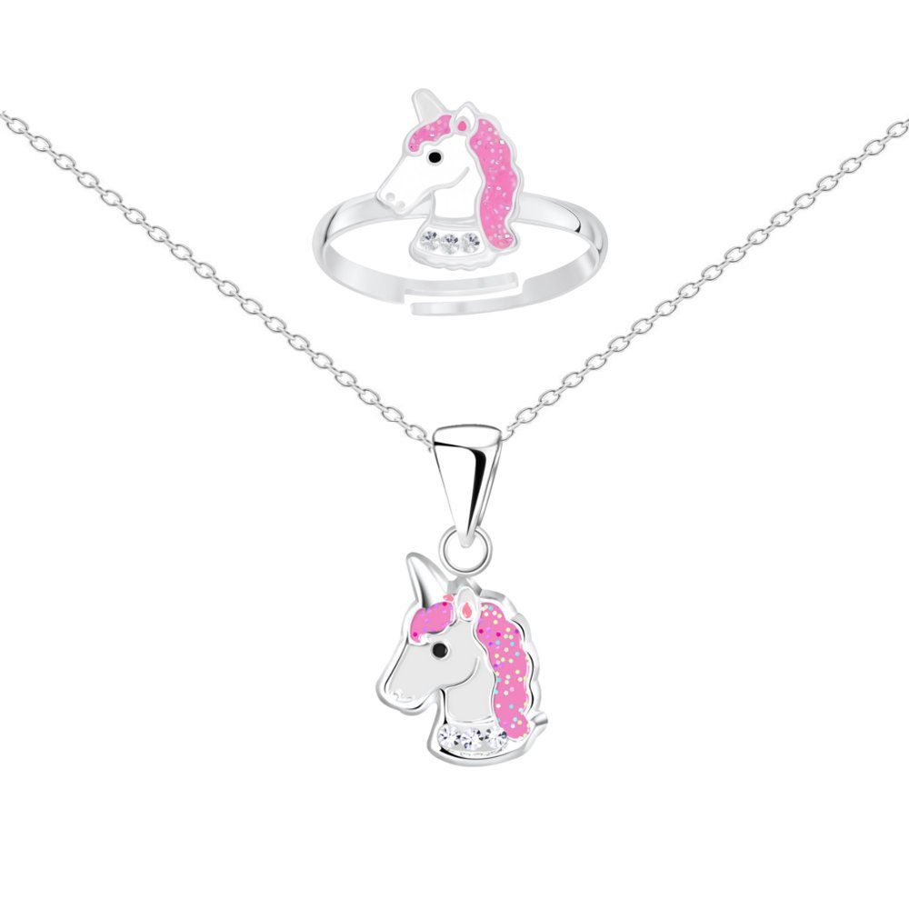 Artikel: 1) Ankerkette (40 cm) mit Anhänger (8 x 10 mm), verstellbarer Kinderring Einhorn (8 x 11 mm) mit Kristall in weiß