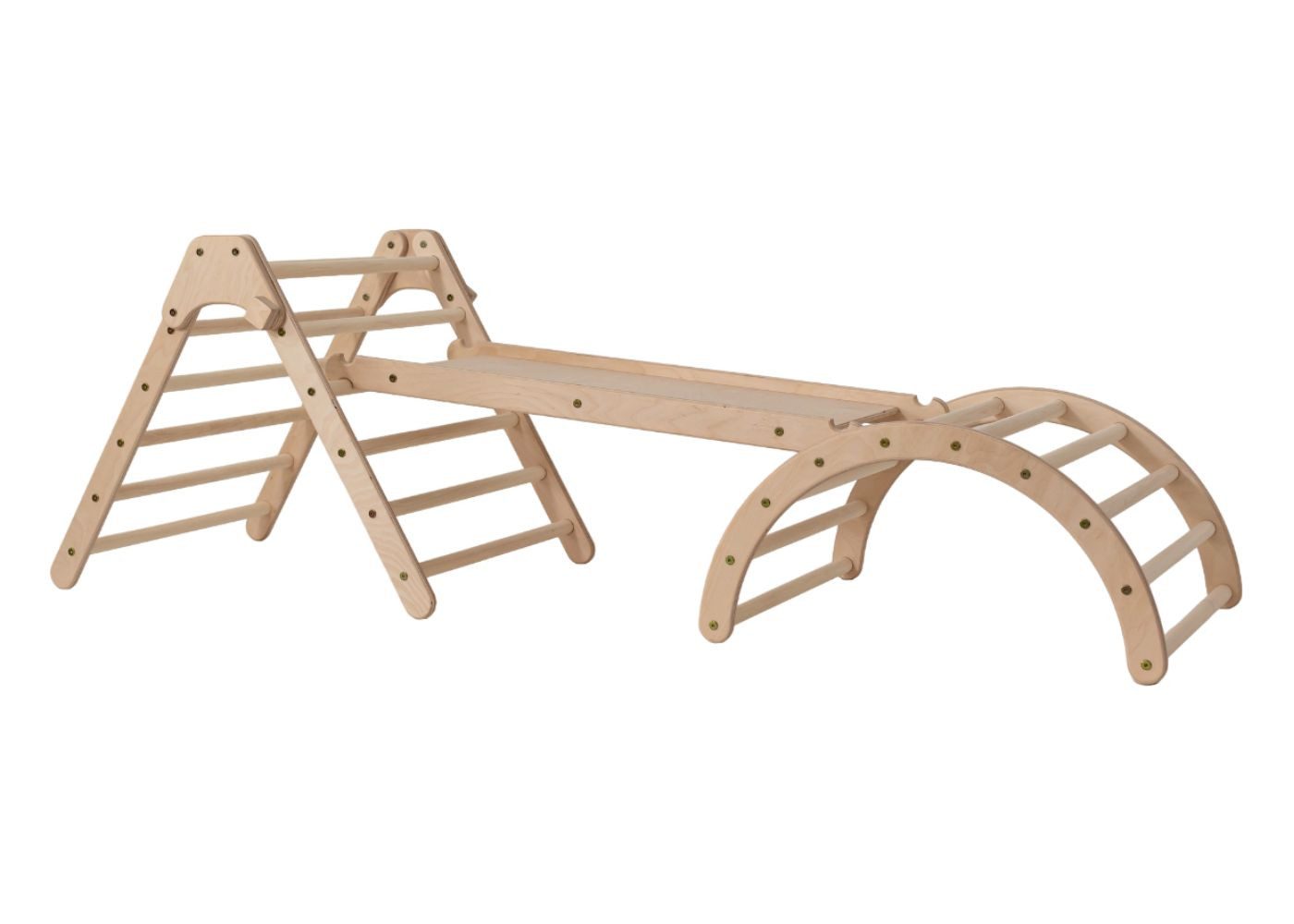 Ich bin das Fold Up Set und ein dreiteiliges Set, das aus einem faltbaren Dreieck, einem Kletterbogen (S) und einem Rutsch- und Kletterbrett besteht.