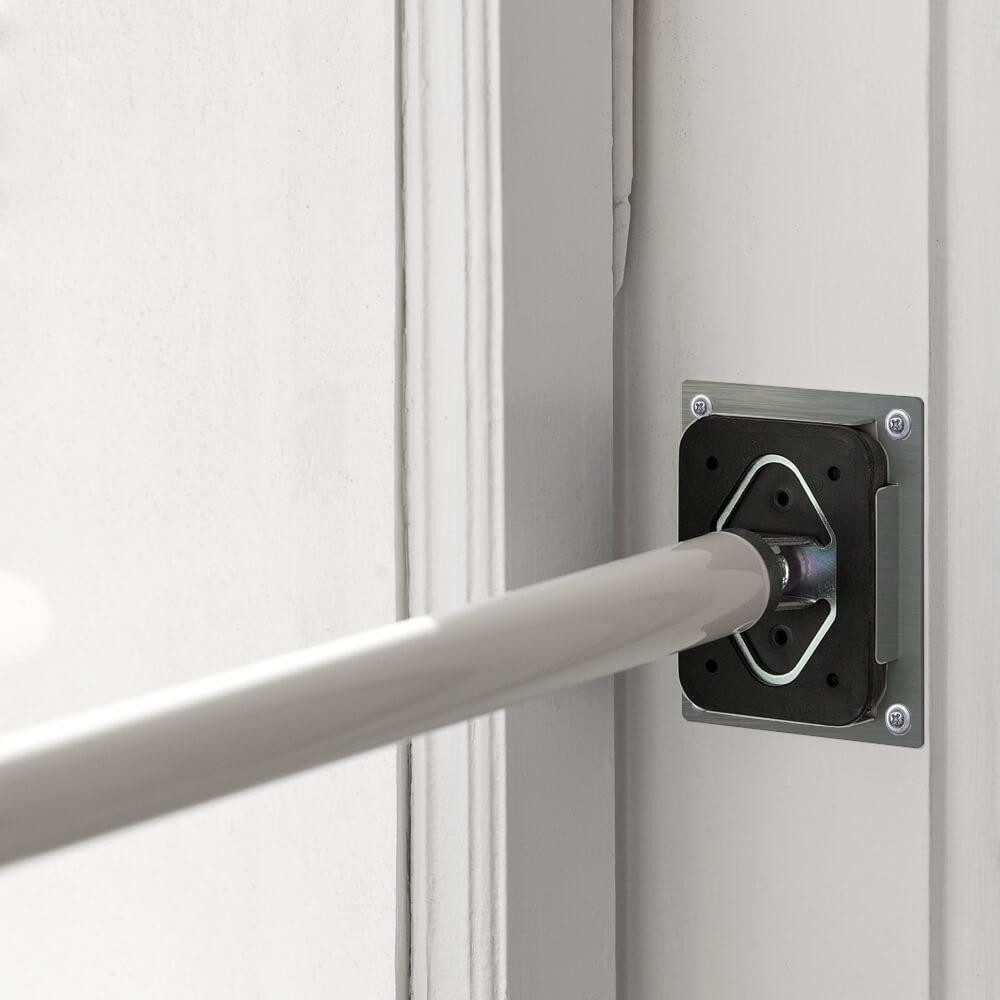 Die Ankerplatte wird mit den mitgelieferten Schrauben und Dübeln links und rechts an der Fensterlaibung befestigt. Die Gummistempel der