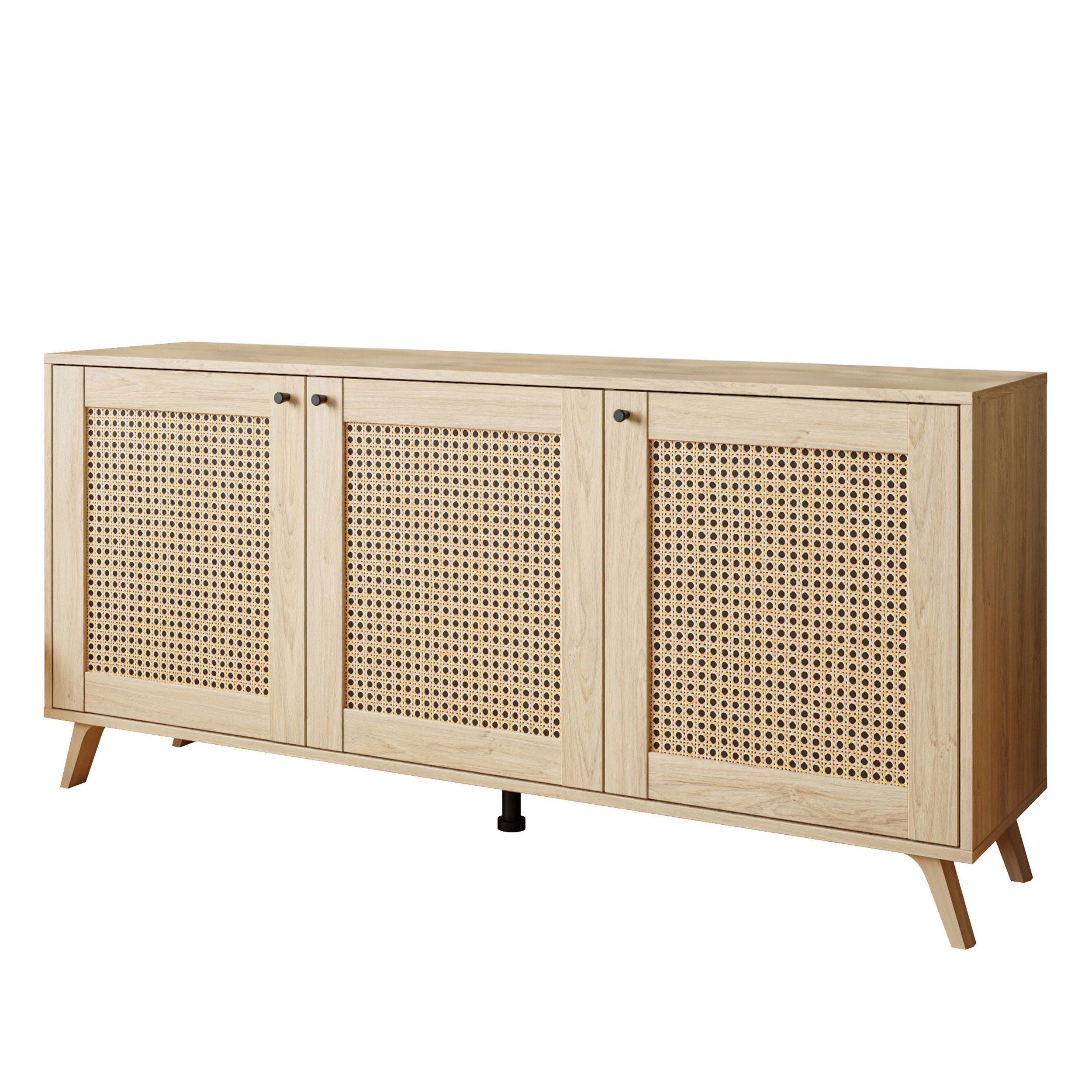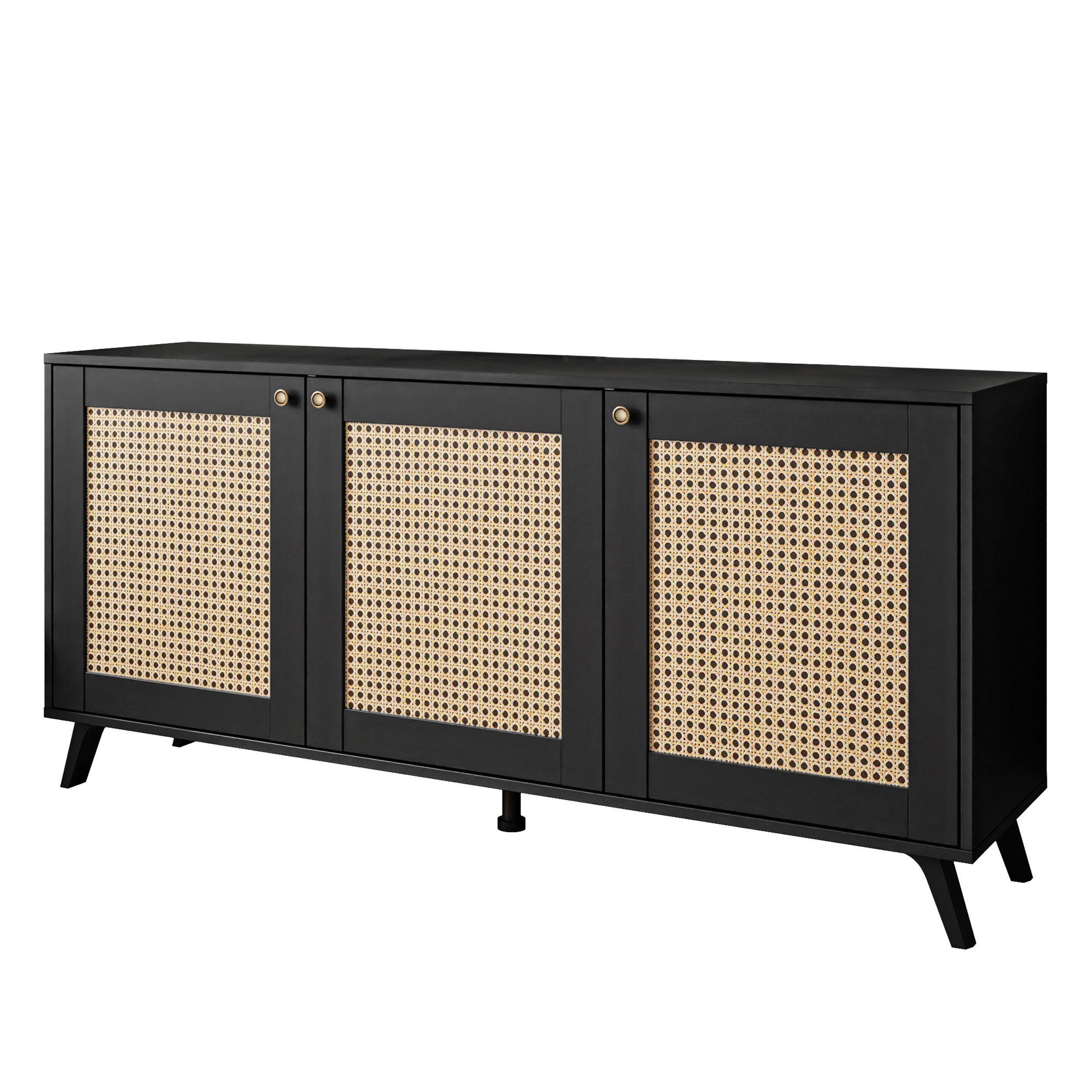 Die moderne und funktionelle Kommode Verona ist mit drei Türen und praktischen Einlegeböden ausgestattet, die eine perfekte Lösung für alle Ihre Organisationsbedürfnisse darstellen. Der klassische schwarze Korpus der Kommode wird mit den originellen Fronten in der Farbe von natürlichem Schilfrohr kombiniert und bildet so ein perfekt harmonisches und ausdrucksstarkes Duo.