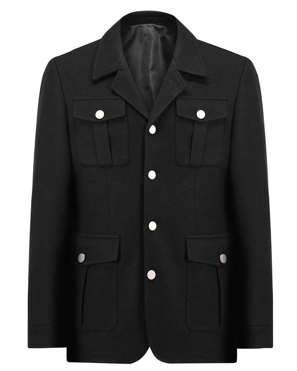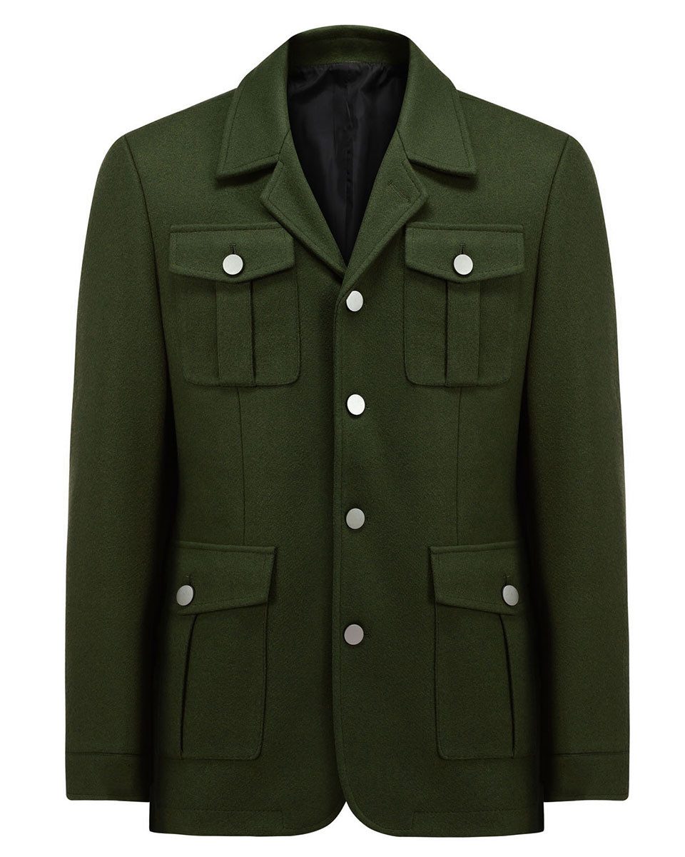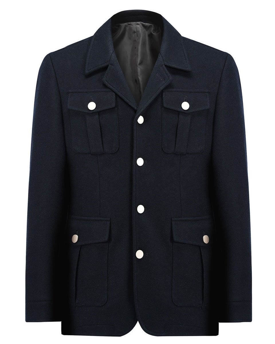 Ein markanter Reverskragen betont die schmale Schulterpartie, während der vierteilige Knopfverschluss für strukturierte Optik und sicheren Sitz sorgt. Ärmel mit dezentem Knopfverschluss am Saum und der traditionelle Rückenschlitz unterstreichen die durchdachte Konstruktion.