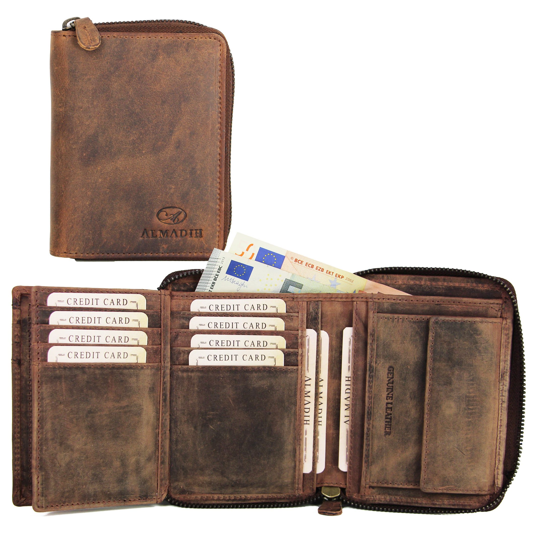 Modell: ALMADIH Leder-Geldbörse für Damen und Herren mit Reißverschluss / Material: Premium Rindsleder.