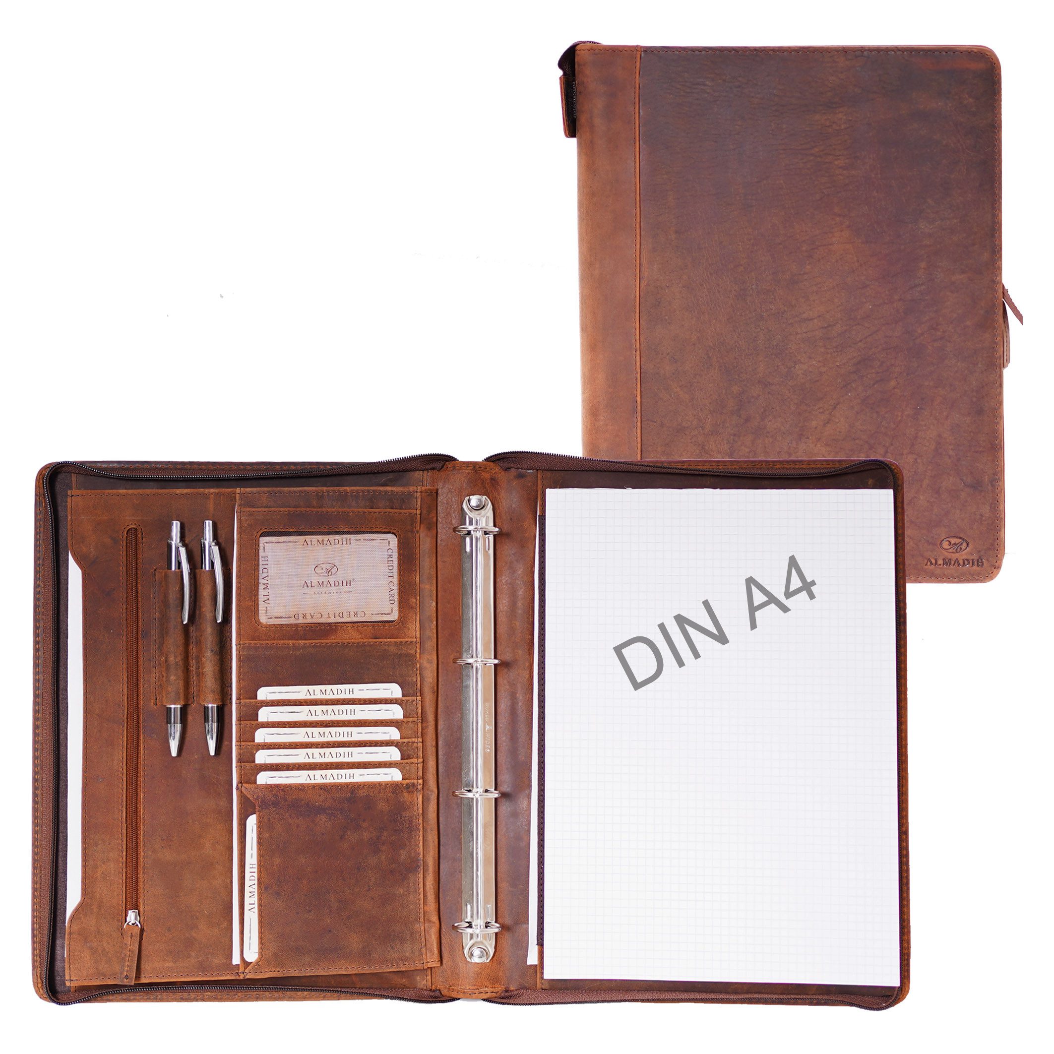 Die ALMADIH Dokumentenmappe in Braun Vintage vereint klassisches Handwerk mit modernem Anspruch an Funktionalität und Stil. Gefertigt aus echtem, hochwertigem Voll-Rindsleder überzeugt diese exklusive Ledermappe mit einer edlen Patina, die mit der Zeit eine einzigartige Optik entwickelt. Die natürliche Vintage-Färbung in Braun verleiht der Mappe eine warme, charaktervolle Ausstrahlung – perfekt für Business, Studium, Kanzlei oder kreative Projekte. Ideal für Tablets bis 12,2 Zoll: Die großzügig gestaltete Innenaufteilung der Mappe bietet nicht nur Platz für A4-Dokumente, Schreibblöcke und Verträge, sondern auch für ein Tablet oder iPad mit einer Размер von bis zu 12,2 Zoll. Zwei große Einsteckfächer, ein separates Reißverschlussfach sowie ein gepolstertes Fach schützen Ihre Technik und Unterlagen optimal. Dank der 2,5 cm Ringbuchmechanik lassen sich gelochte Blätter, Kalender oder Organizer bequem einheften und individuell anpassen. Drei Stiftehalter, sechs Fächer für Visitenkarten oder Kreditkarten, ein Smartphone-Fach und ein Fach für Taschenrechner oder Powerbank machen diese Mappe zum Allrounder im Büroalltag oder auf Geschäftsreisen. Sicher & stilvoll unterwegs: Der stabile Rundum-Reißverschluss sorgt für maximale Sicherheit Ihrer Unterlagen, während der komfortable Tragegriff ein praktisches Handling ermöglicht – ob beim Kundenmeeting, im Hörsaal oder auf Reisen. Die Innenseite ist vollständig mit weichem Leder ausgeschlagen, inklusive dem Bereich unter dem Schreibblock – ein klares Zeichen für Qualität, Langlebigkeit und Liebe zum Detail. Details: Modell: ALMADIH Leder Dokumentenmappe A4 mit Reißverschluss und Tragegriff Material: Premium Rindsleder Zubehör: 1 A4 Schreibblock (ohne Kugelschreiber) Maße: ca. 33 x 27 x 4 cm (Длина x Höhe x Tiefe) Leergewicht: ca. 0,9 kg Ausstattung: 1 Ringbuchmechanik Ø 2,5 cm 1 große Steckfächer für Bücher oder Tablet-PC 1 Reißverschlussfach 2 Stiftehalter 6 Visitenkartenfächer 2 Fächer für Taschenrechner und Handy 1 Papierblockfach 1 A4 Einsteckfach