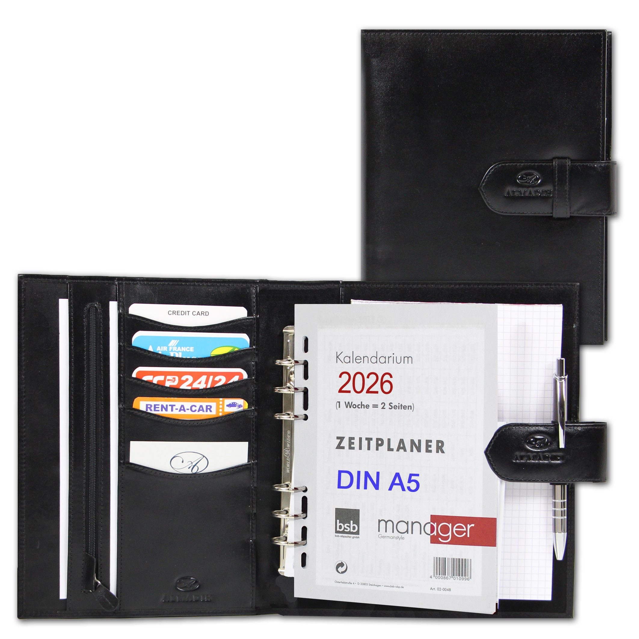 Der ALMADIH A5 Terminplaner in Schwarz ist eine perfekte Kombination aus Eleganz, Funktionalität und hochwertiger Verarbeitung, die speziell für den anspruchsvollen Nutzer entworfen wurde. Gefertigt aus echtem Voll-Rindsleder, bietet dieser Terminplaner nicht nur eine langlebige Beschaffenheit und eine edle Optik, sondern auch eine angenehme Haptik. Die schwarze Farbgebung und das sorgfältig ausgewählte Leder verleihen der Mappe eine unverwechselbare Ausstrahlung, die in jedem geschäftlichen oder privaten Kontext für bewundernde Blicke sorgt. Ausgestattet mit einer Ringbuchmechanik von 2,5 cm Durchmesser und optimal angeordneten Ringabständen, ermöglicht der Terminplaner eine flexible und effiziente Organisation Ihrer Unterlagen. Das Reißverschlussfach bietet sicheren Stauraum für wichtige Dokumente, während zwei schmale Steckfächer und fünf Visitenkartenfächer eine übersichtliche Aufbewahrung von Notizen und Kontakten gewährleisten. Das Papierblockfach und der Stiftehalter erhöhen die Praktikabilität des Terminplaners, indem sie sicherstellen, dass Sie stets alles Nötige für Notizen und Besprechungen griffbereit haben. Inklusive einer Kalendereinlage, ist der ALMADIH A5 Terminplaner in Schwarz der ideale Begleiter für alle, die eine kompakte und stilvolle Lösung für die Verwaltung ihrer Termine und Aufgaben suchen. Details: Modell: ALMADIH Leder-Terminplaner A5 mit Ringmechanik Farbe: Schwarz Material: Premium Rindsleder Maße: ca. 19 x 24 x 3,5 cm (Длина x Höhe x Tiefe) Zubehör: 1x A5 Schreibblock + A5 Kalendereinlage Ausstattung: 1 Ringbuchmechanik Ø 2,5 cm Ringabstände: 1,9 - 1,9 - 5 - 1,9 - 1,9 cm 1 Reißverschlussfach 2 schmale Steckfächer 5 Visitenkartenfächer 1 Papierblockfach 1 Stiftehalter Lieferung inklusive Kalendereinlage