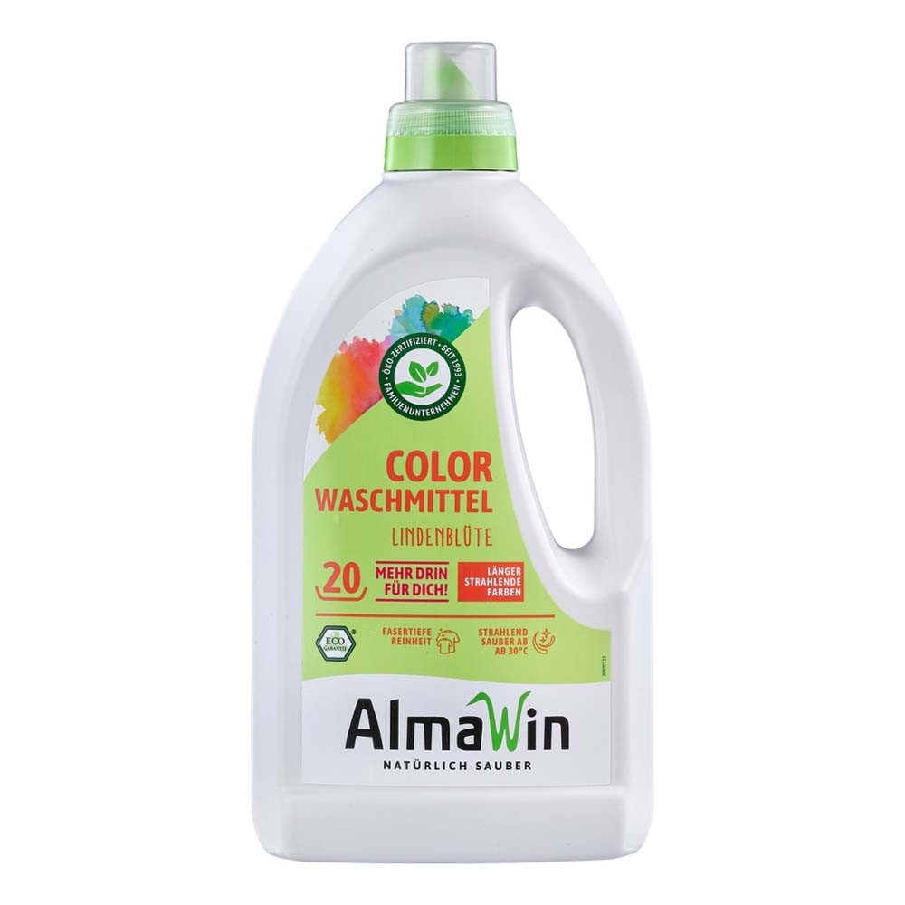 Das AlmaWin Flüssigwaschmittel Color wäscht farbige Textilien stahlend rein und sorgt für angenehmen Lindenblütenduft. Es pflegt die Textilfasern und schützt zusätzlich vor deren Verblassen - für eine dauerhafte Farbbrillanz.