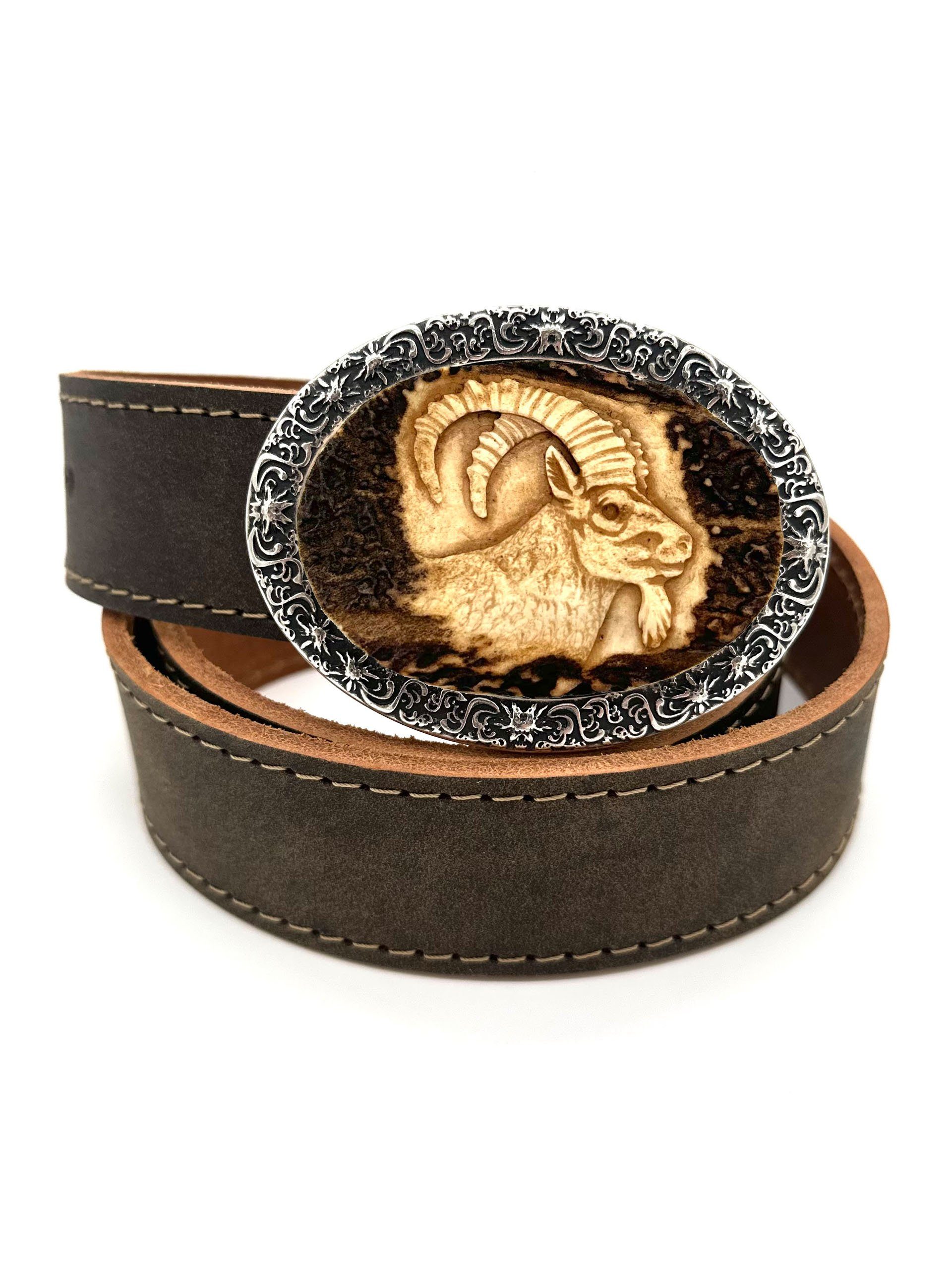Materialzusammensetzung | Gürtel: 100% Rindsleder, Schließe: 100% Altsilber, Schnitzerei: 100% Hirschhorn |