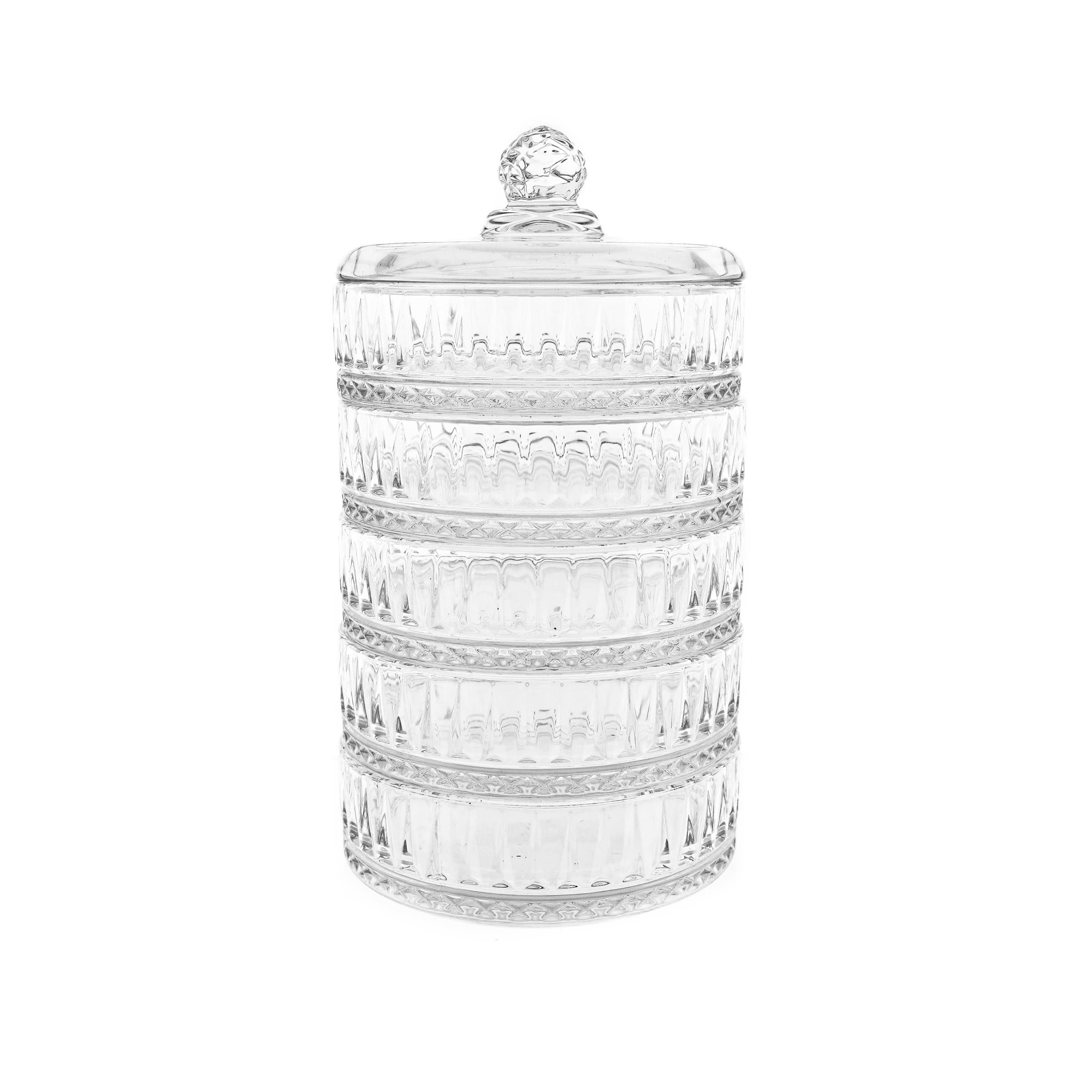 Dieses edle 5-stöckige Glasschalen-Set mit Deckel ist die perfekte Lösung für die stilvolle Präsentation und Aufbewahrung Ihrer Lieblingsleckereien. Ob für Desserts, Snacks oder Gebäck – das elegante Riffle-Design und die hochwertige Verarbeitung machen es zu einem Highlight auf jeder Tafel.