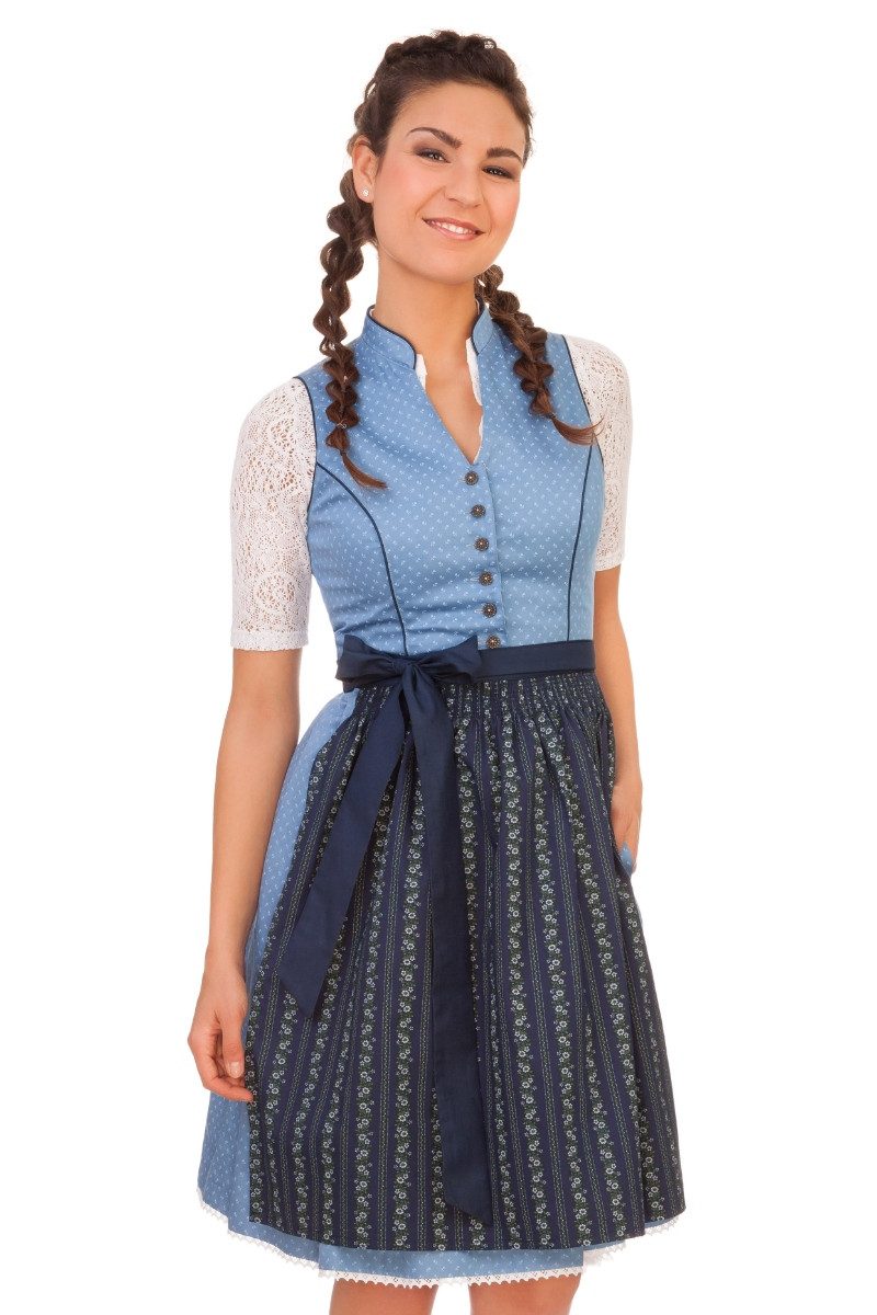 Material Dirndl: 100% Baumwolle Material Futter: 50% Baumwolle, 50% Polyester Material Schürze: 100% Baumwolle Farbe: Hellblau/Marine Größen: 30 - 50 Chemische Reinigung, bügeln auf Stufe 1 Schürze: 30°C Feinwäsche