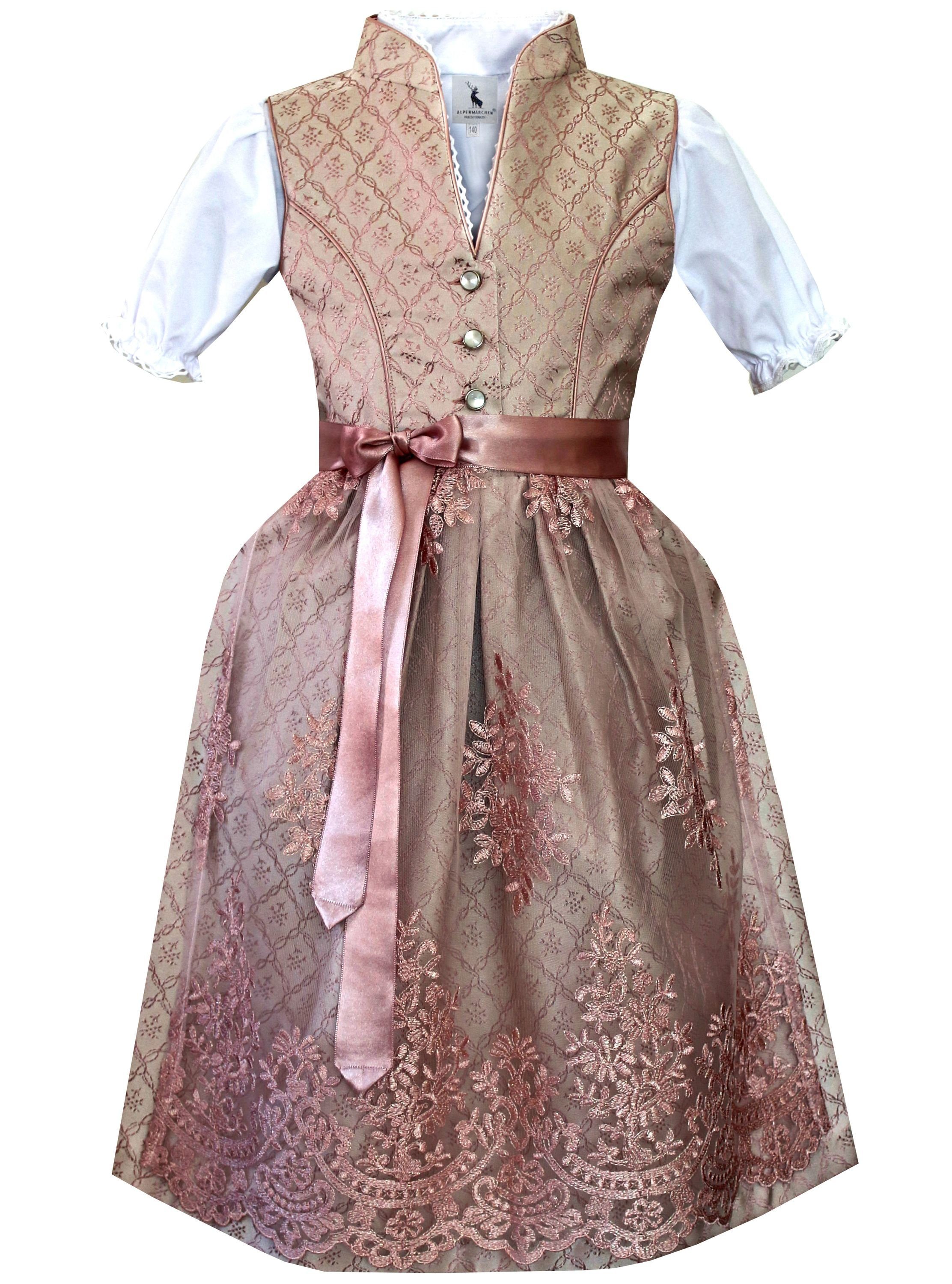 Das Dirndl Bella vereint bayerische Tradition mit kindgerechter Leichtigkeit. In zarten Rosatönen mit feinen Ornamenten und einer aufwendig gearbeiteten Spitzenschürze strahlt es eine zeitlose Eleganz aus. Der hochgeschlossene Kragen, die süße Knopfleiste und die passende weiße Bluse runden das harmonische Gesamtbild ab. Dank hochwertiger Verarbeitung und weicher Materialien bietet das Dirndl angenehmen Tragekomfort und viel Bewegungsfreiheit – perfekt für Familienfeiern, Trachtenfeste oder das Oktoberfest. Eltern freuen sich über den praktischen seitlichen Reißverschluss, der das An- und Ausziehen kinderleicht macht. Zudem ist das Dirndl pflegeleicht und damit alltagstauglich. Bella ist ein liebevoll gestaltetes Festtagsoutfit, das Mädchen gerne tragen und Eltern mit gutem Gewissen auswählen.