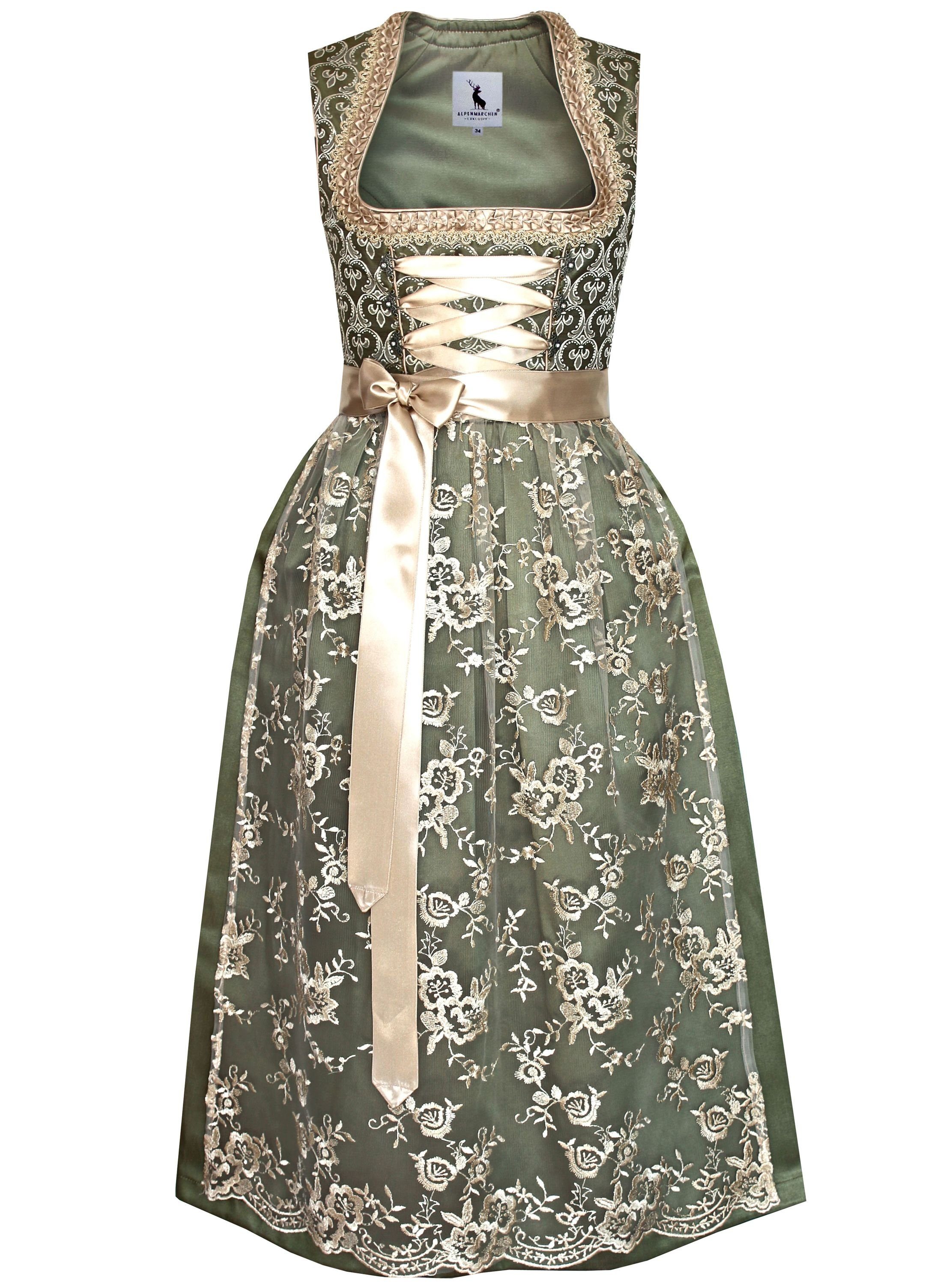 Mit dem langen Dirndl Thea in elegantem grün und creme setzen Sie auf klassische Schönheit mit liebevollen Details. Das fein ornamentierte Oberteil mit geradem Ausschnitt und edler Bordüre verleiht dem Dirndl eine stilvolle Note, während der einfarbige Rock (85 cm Длина) für eine anmutige Silhouette sorgt. Die aufwendig gearbeitete Spitzenschürze und das farblich abgestimmte Band runden den Look perfekt ab. Dank des seitlichen Reißverschlusses ist das Anziehen unkompliziert, und der hohe Tragekomfort macht Thea zum idealen Begleiter – ob auf dem Oktoberfest, beim Volksfest oder zu festlichen Anlässen. Ein Dirndl, das begeistert: pflegeleicht, vielseitig kombinierbar und einfach wunderschön.
