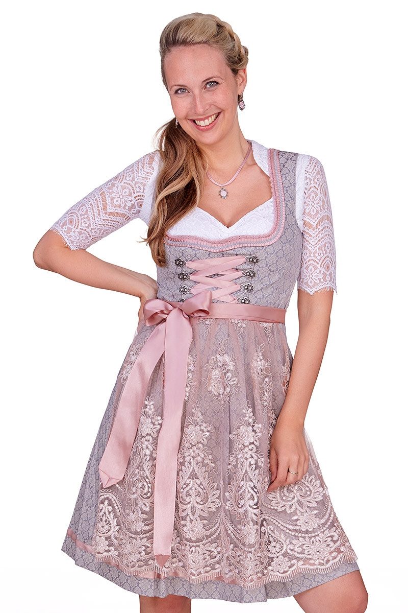 Material Dirndl: 100% Baumwolle Material Futter Mieder: 65% Polyester, 35% Baumwolle Material Schürze: 100% Polyester Farbe: grau Größen: 30 - 48 Handwäsche