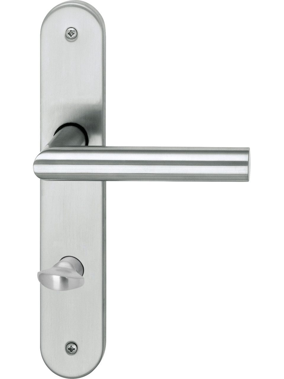 Die modern abgerundete Langschildgarnitur Martina von eignet sich für Türen im WC- und Badbereich. Sie ist aus einer hochwertigen Metallunterkonstruktion gefertigt, die sichtbar verschraubt wird.