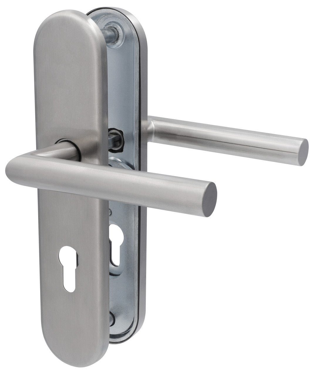 Lochung: Profilzylinder/Schließzylinder | Варианты: Drücker/Drücker | Form Schild: abgerundet | DIN-Richtung: rechts/links | Lochabstand: 92 mm | Höhe Schild: 25,0 cm | Breite Schild: 5,5 cm | Stärke Schild: 14,5 mm | Ausladung Drücker: 5,6 cm | Длина Drücker: 13,5 cm | Durchmesser Drücker: Ø 2,0 cm | Maße Vierkantstift: 8,0 mm | Verschraubung: verdeckt | Geeignet für Türstärken von-bis: 37 - 42 mm | Material: Edelstahl | Oberfläche: satiniert | Farbe: silber | Lieferumfang: 1 Türbeschlag |