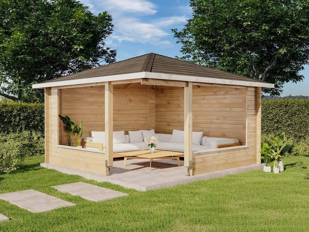 Das Pavillon ist gefertigt in Blockbohlenbauweise aus Nordische Fichte