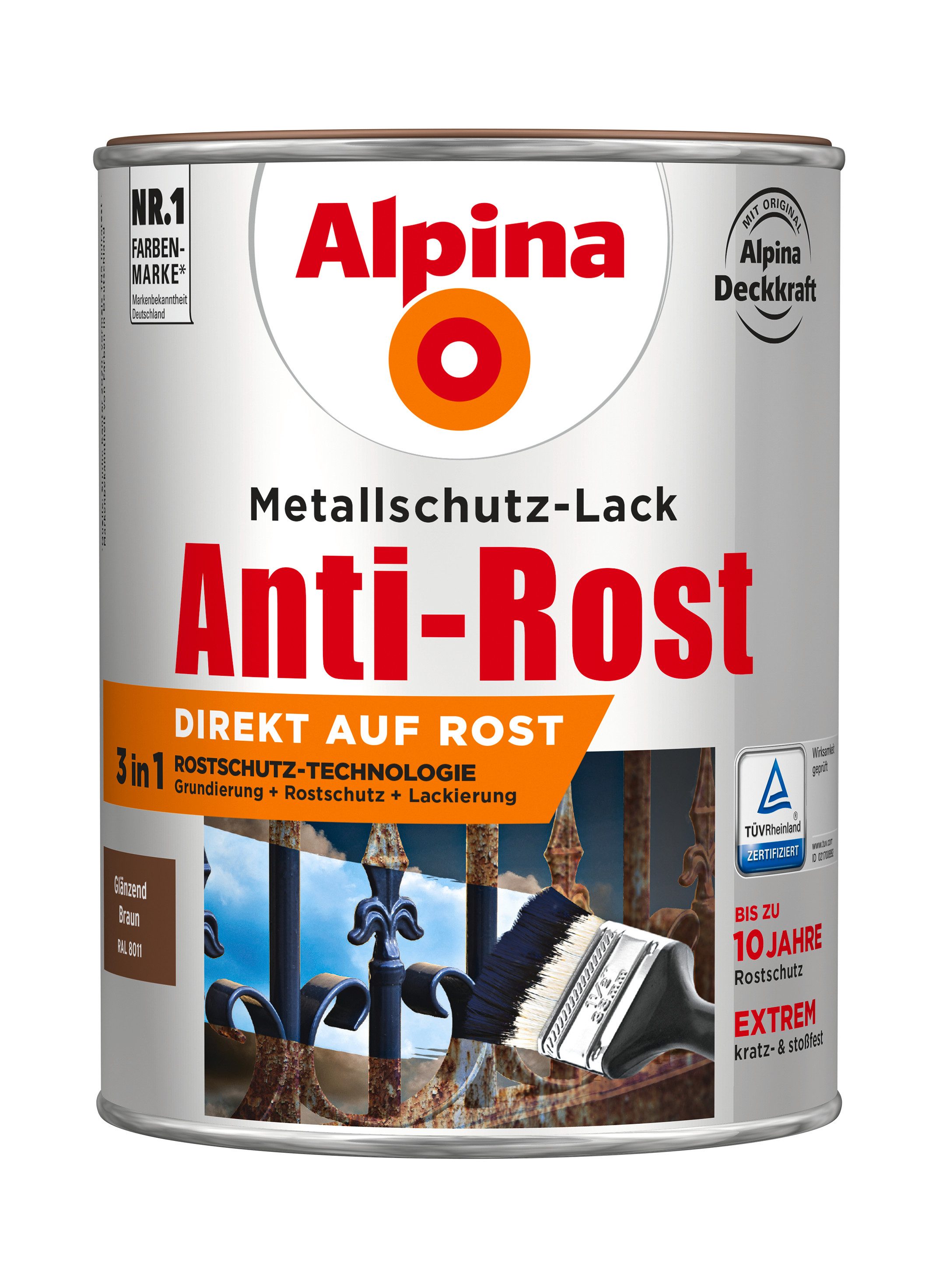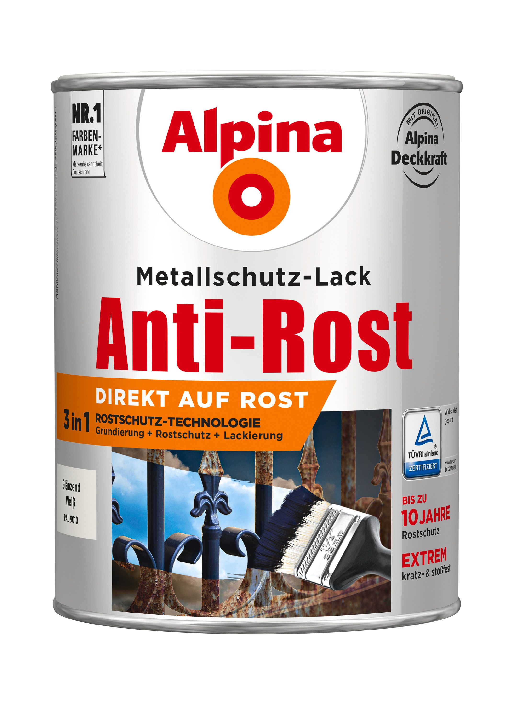 Alpina Anti-Rost Metallschutz-Lack vereint eine ausgezeichnet haftende Grundierung, wirkungsvollen Langzeit-Korrosionsschutz und eine dickschichtige Lackierung. Damit verringert sich der Zeitaufwand der Verarbeitung deutlich.