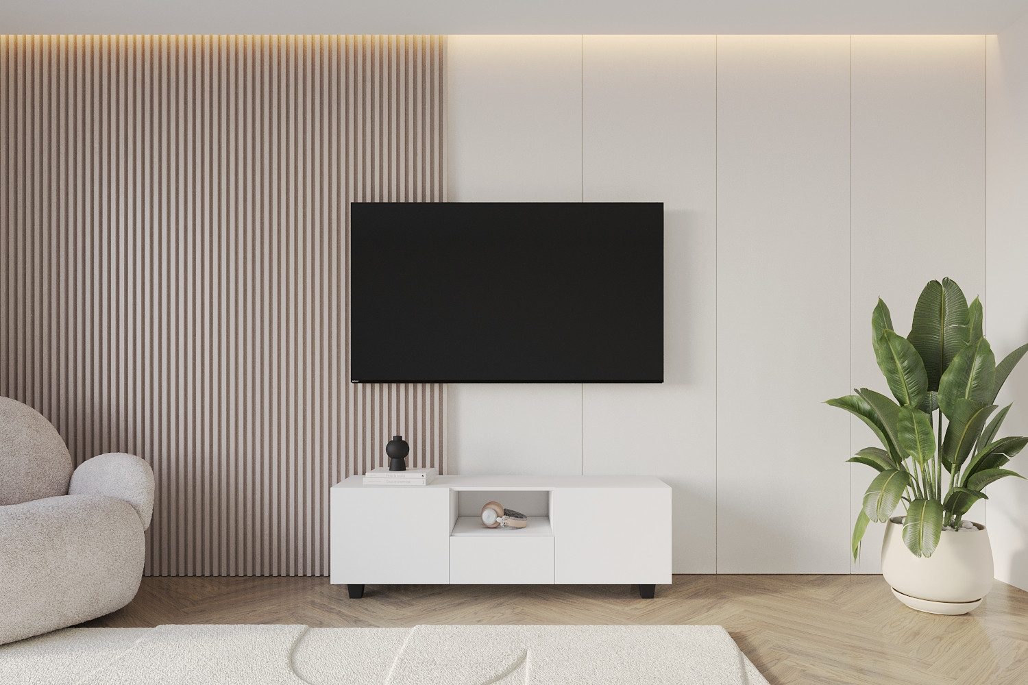 Die solide Möbelplatte garantiert Stabilität und eine lange Nutzungsdauer. Die eleganten Füße erleichtern das Staubsaugen unter dem Möbel und verleihen dem TV-Möbel eine moderne Optik.
