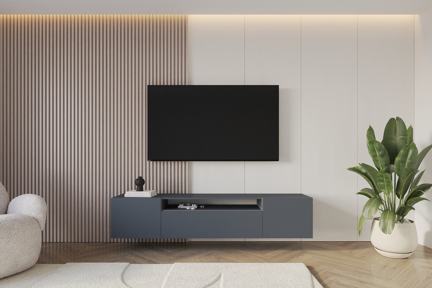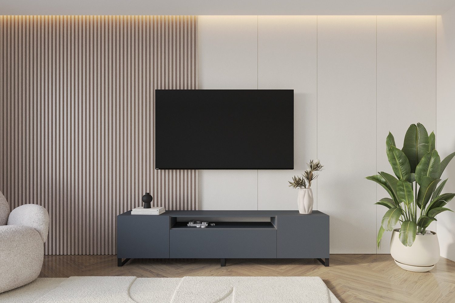Die Fächer mit Klapptür bieten zusätzlichen Stauraum für verschiedene Accessoires, Zeitschriften, CDs, DVDs, Kabelboxen, Spielkonsolen, Beamer und Multimediageräte. Die grifflosen Fronten mit praktischer Push-to-open-Funktion sorgen für noch mehr Bedienkomfort.